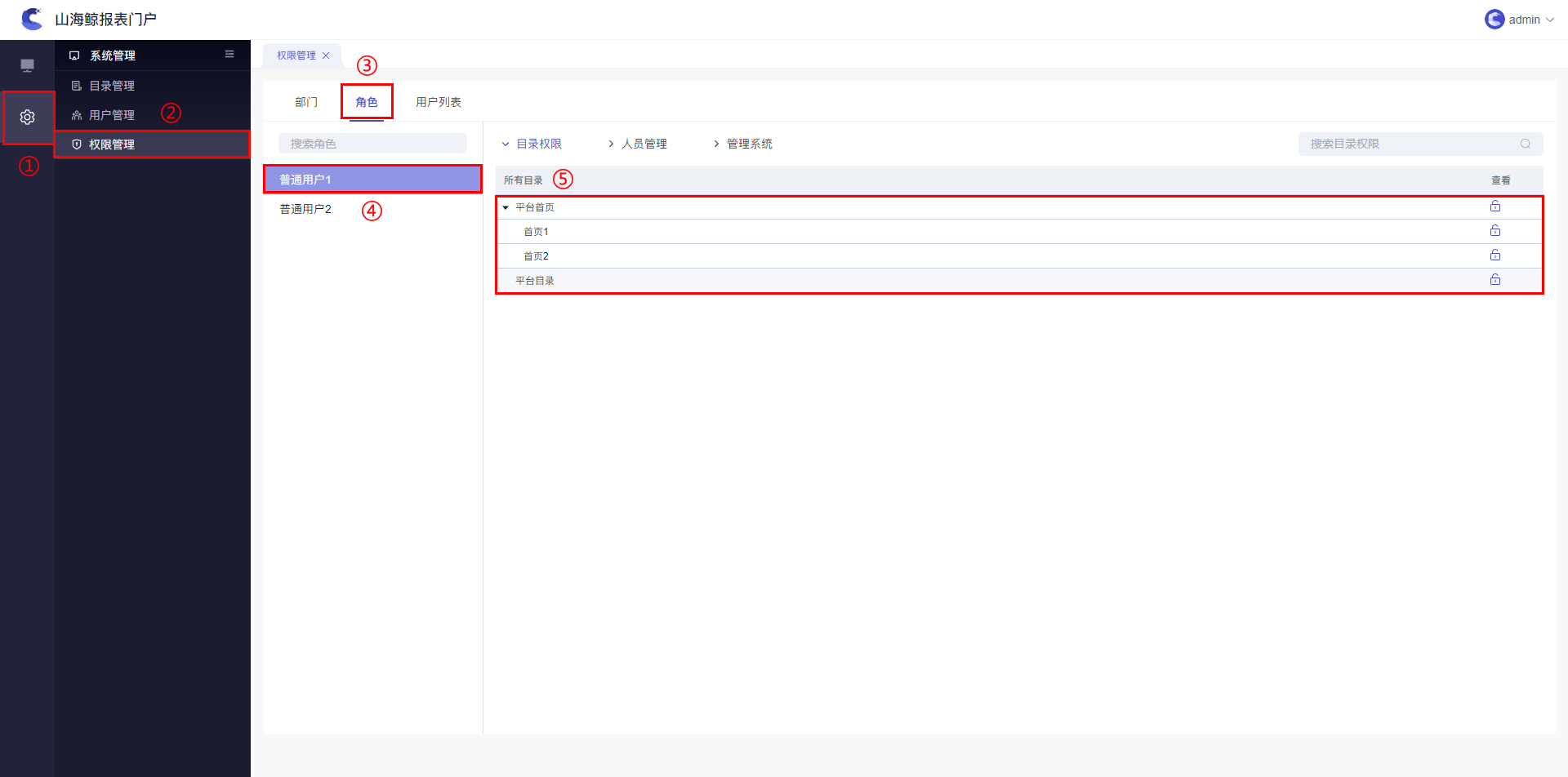 管理员登录报表门户系统,点击“管理系统>权限管理>角色”。