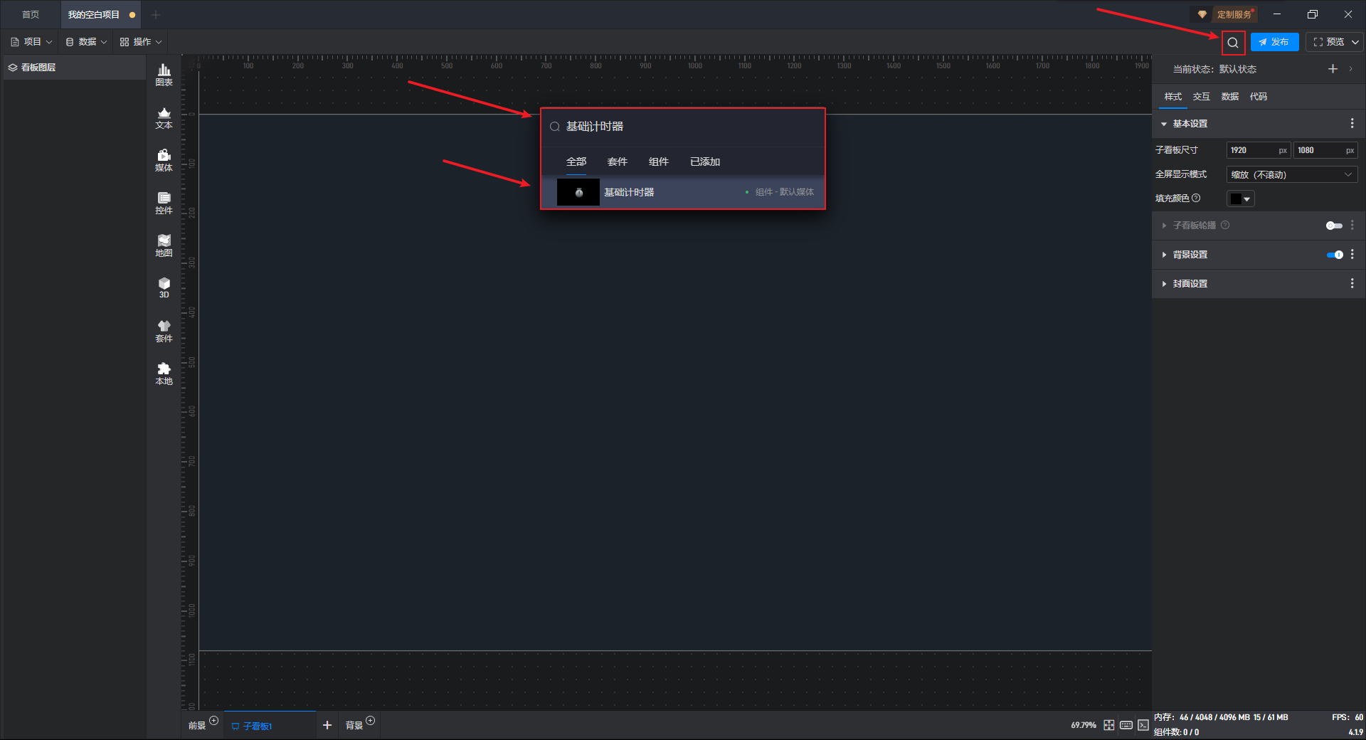 点击搜索按钮或按键盘“Ctrl+F”键打开搜索框,输入组件名称进行搜索,然后点击对应的组件进行添加。