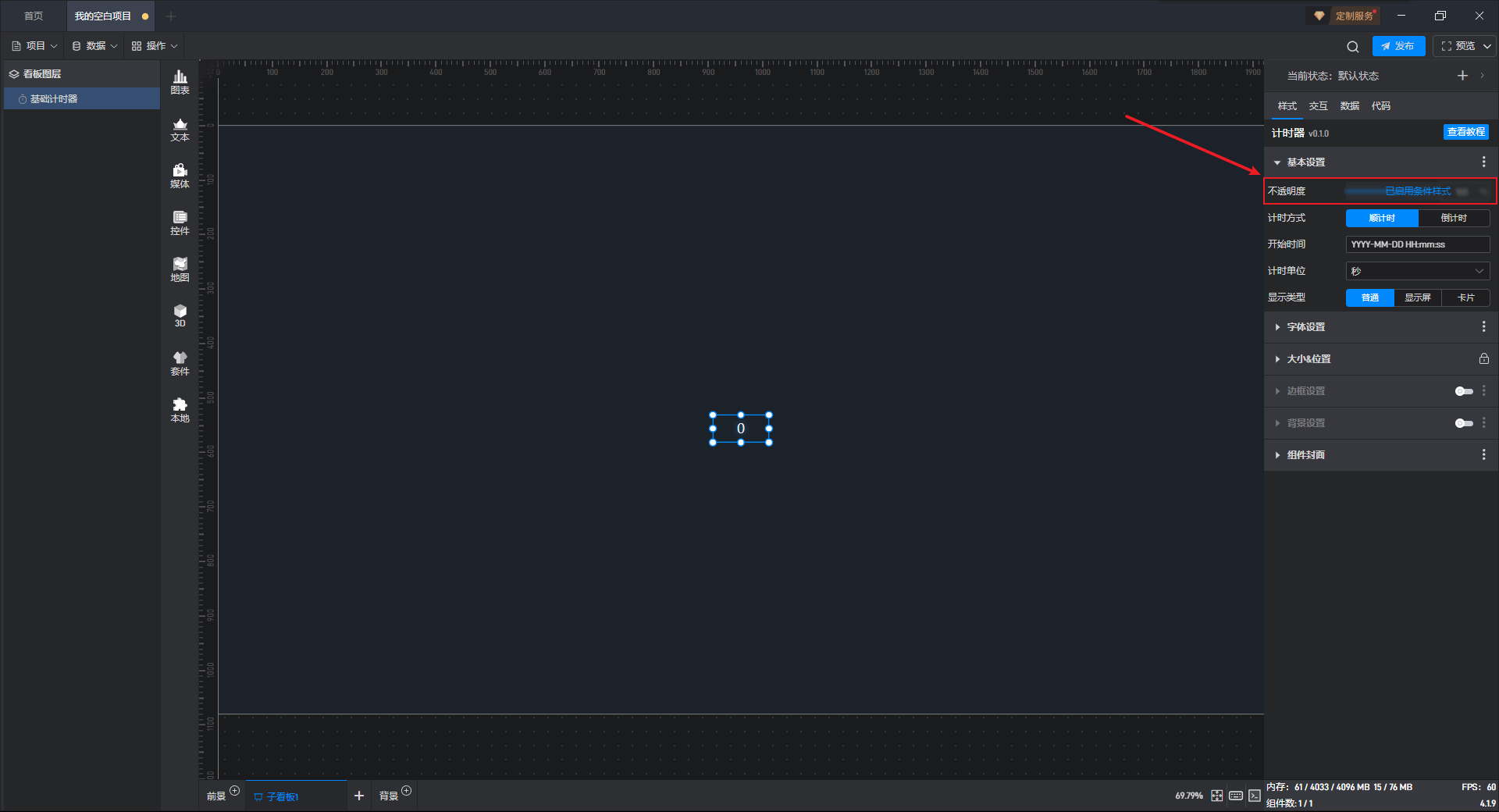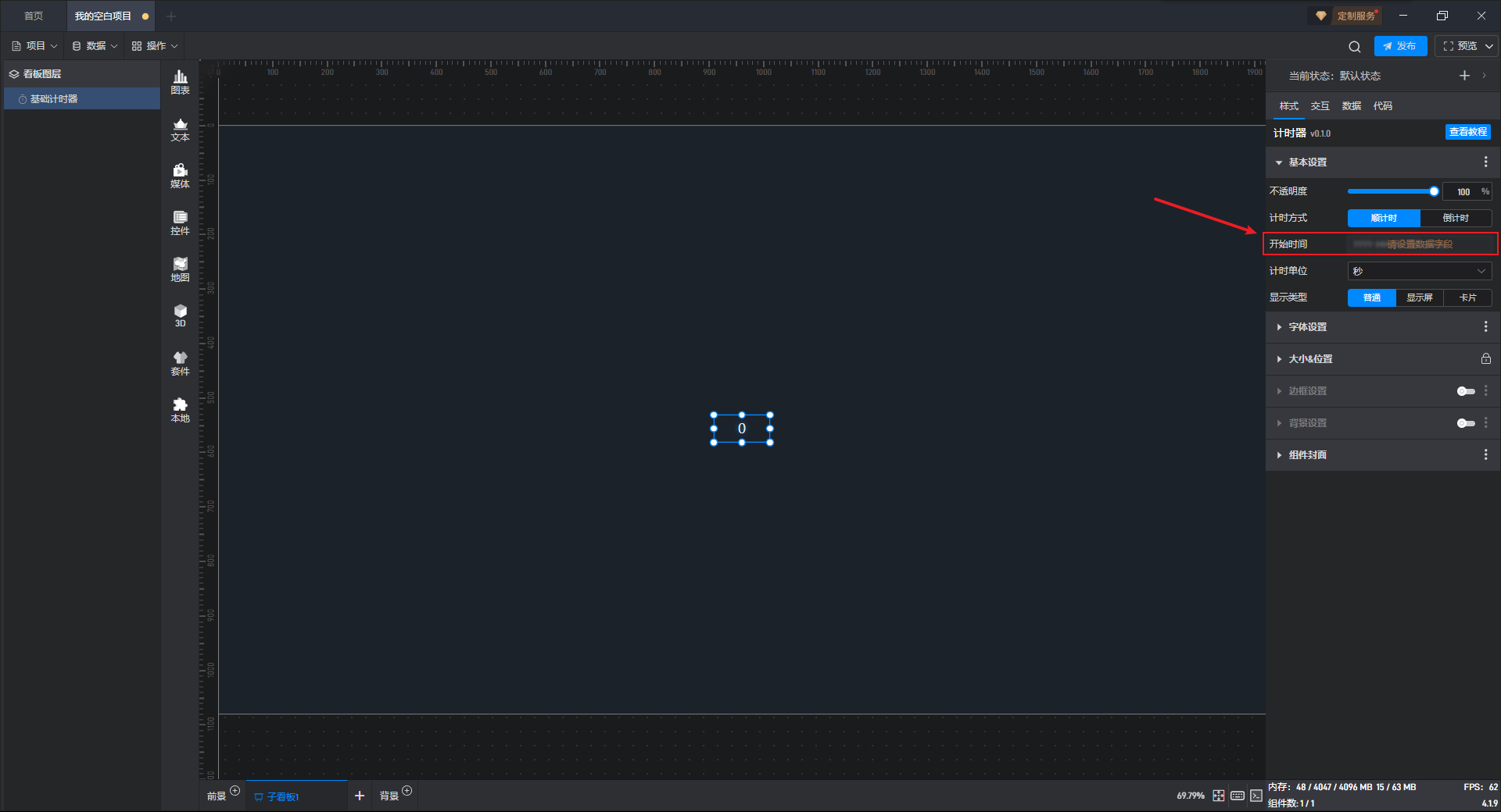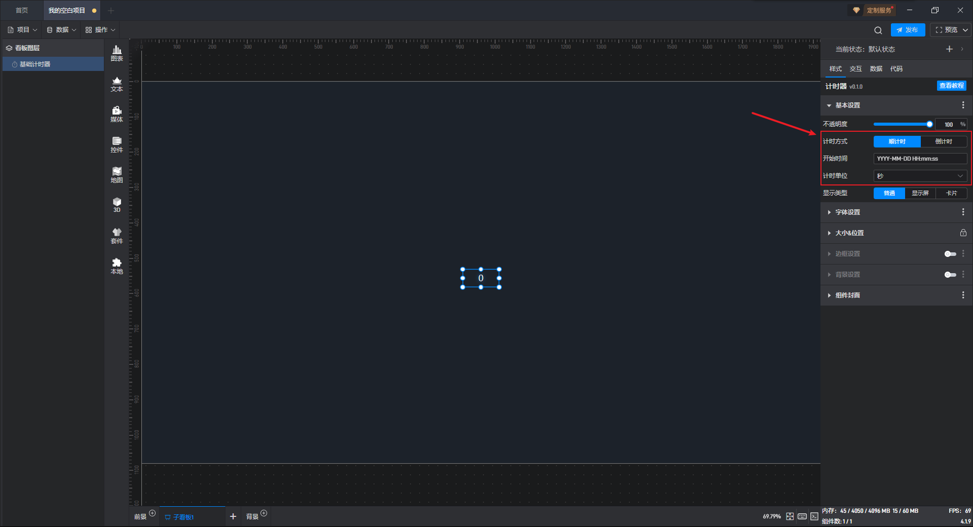 点击选中计时器组件,在右侧样式窗口的基本设置分组中,我们可以对计时器计时方式、开始时间和时区进行设置。