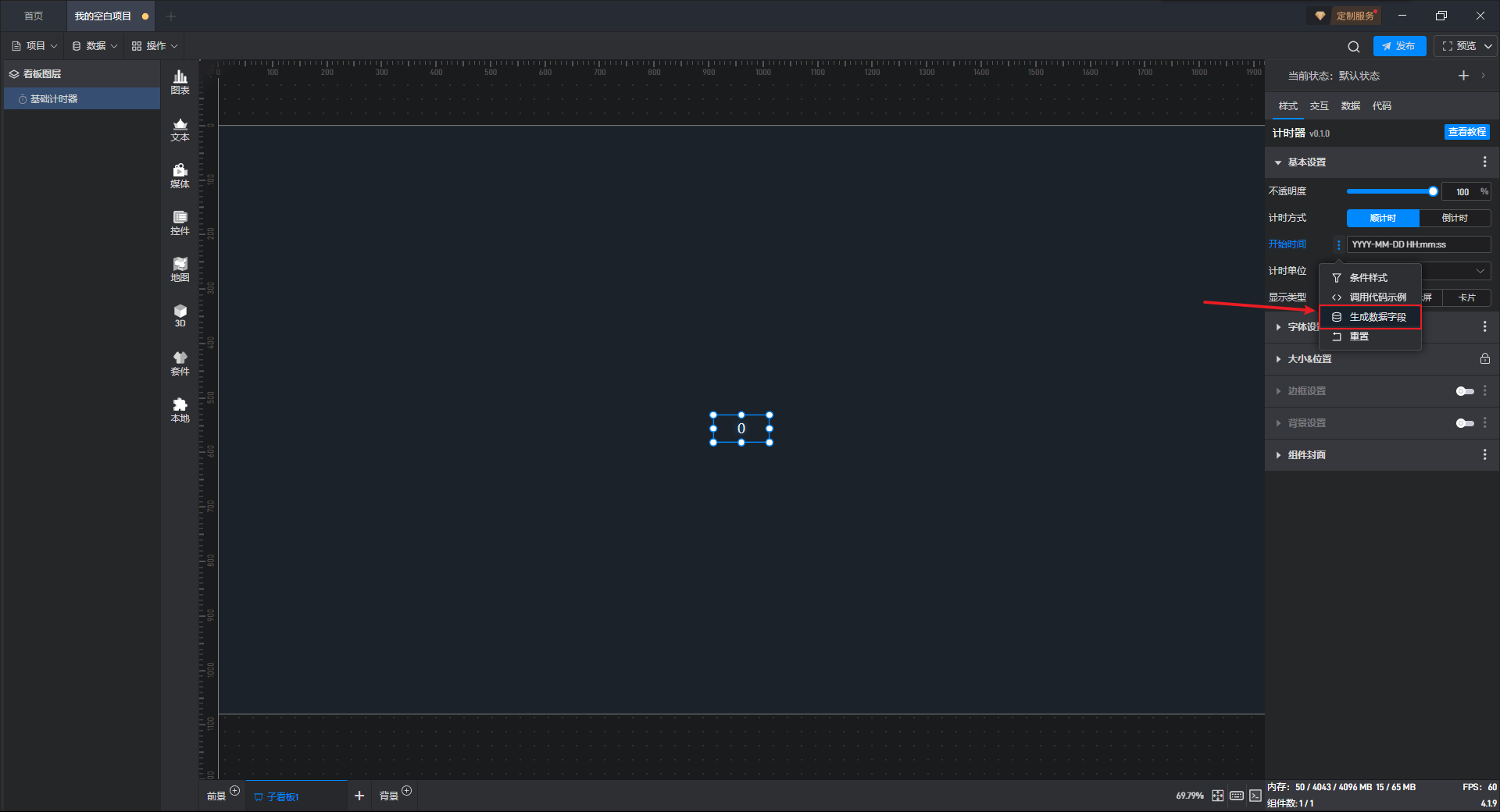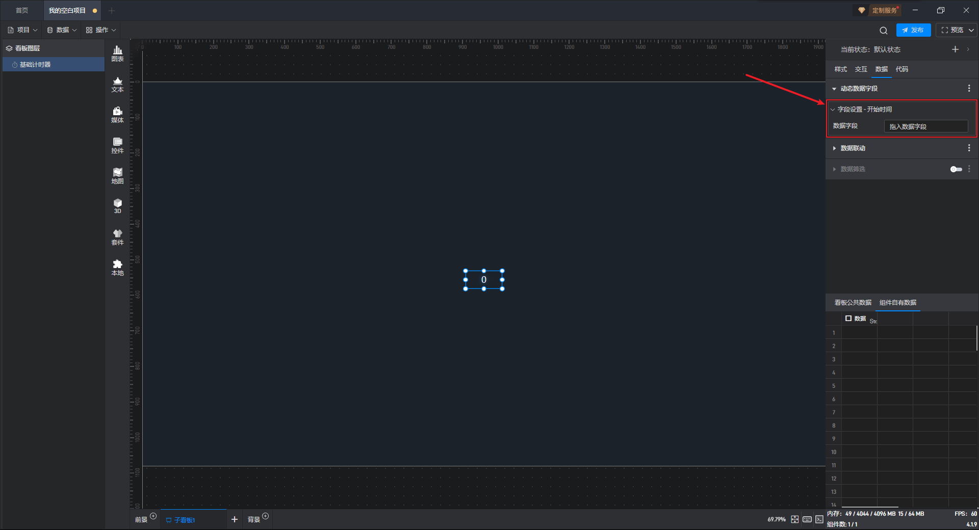 因为计时器组件默认没有数据字段,此时我们需要用到动态数据字段的功能,这个功能是针对设置项生成一个关联的数据字段,从而可以通过数据字段来对设置项的内容进行控制。