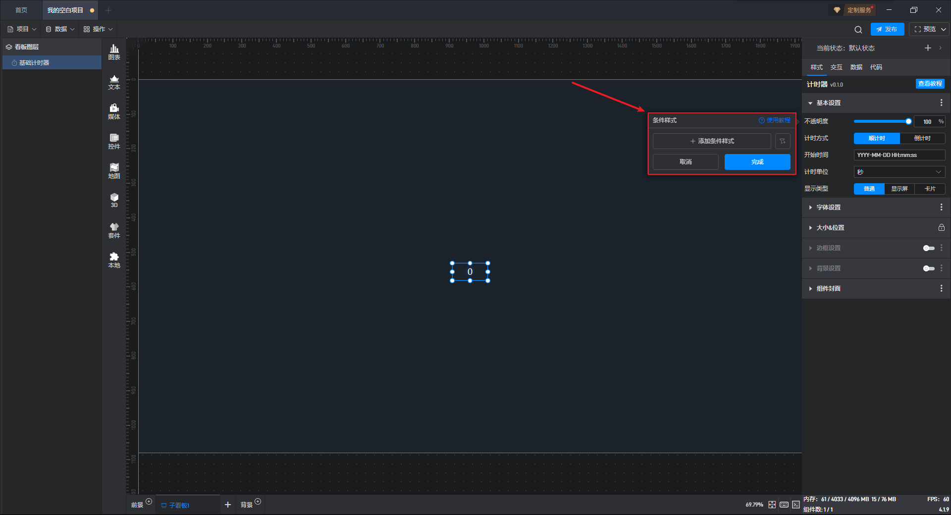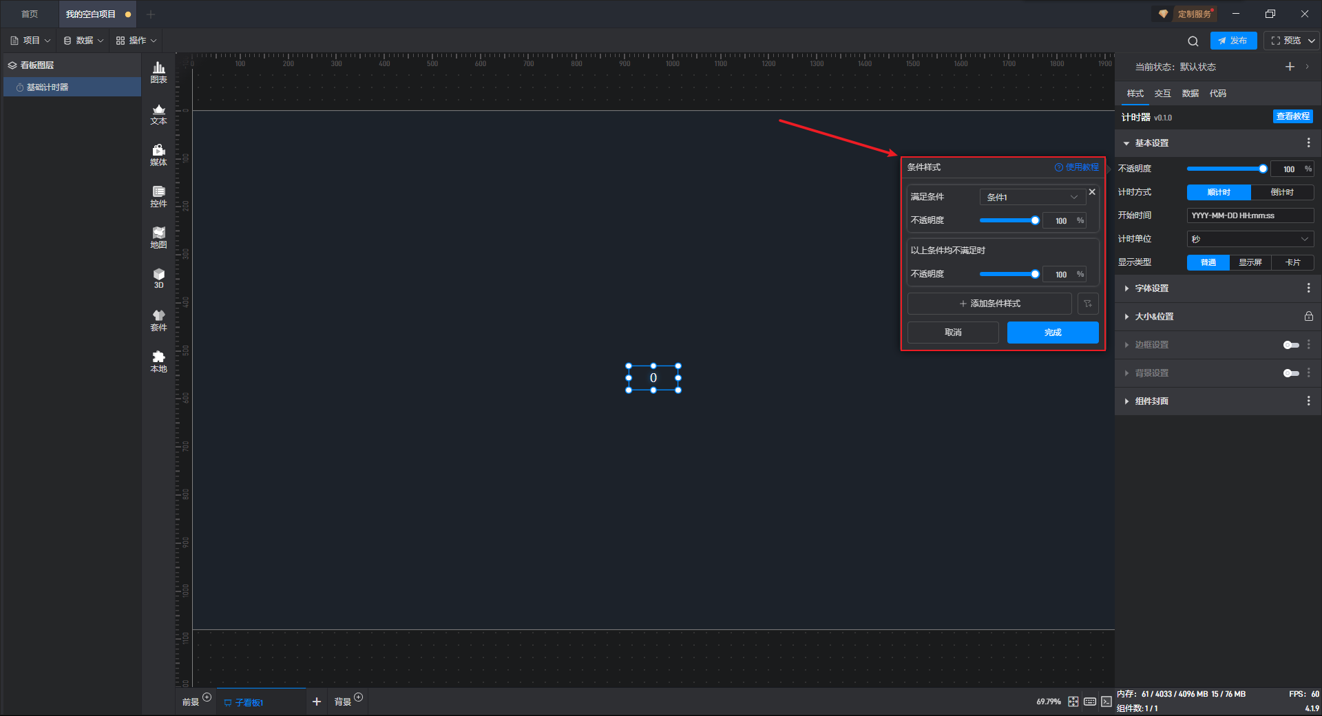 有一些设置项的条件设置方式直接显示在设置项中,这种就可以直接在外面设置,但基础计时器组件的条件样式只能通过方式 1 进行设置。