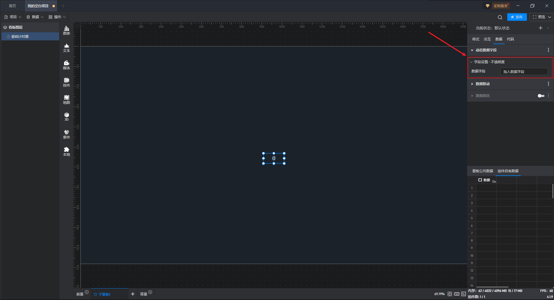 添加一个数值为“0”的数据到数据字段中,可以看到通过动态数据字段将不透明度的数值修改为“0”,从而使组件隐藏。