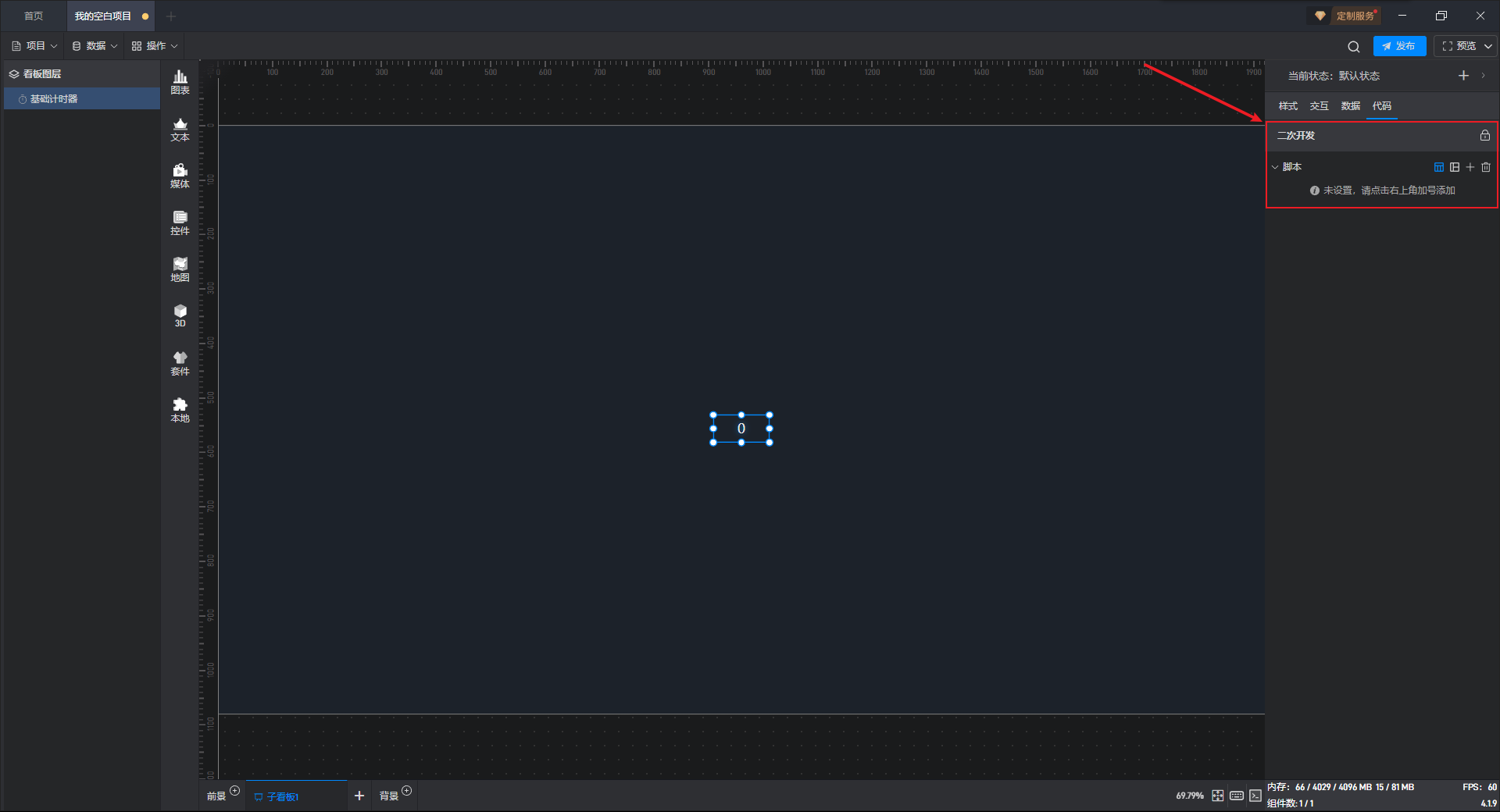 点击选中组件,在右侧设置窗口中切换到“代码”,可以对组件进行二次开发设置。