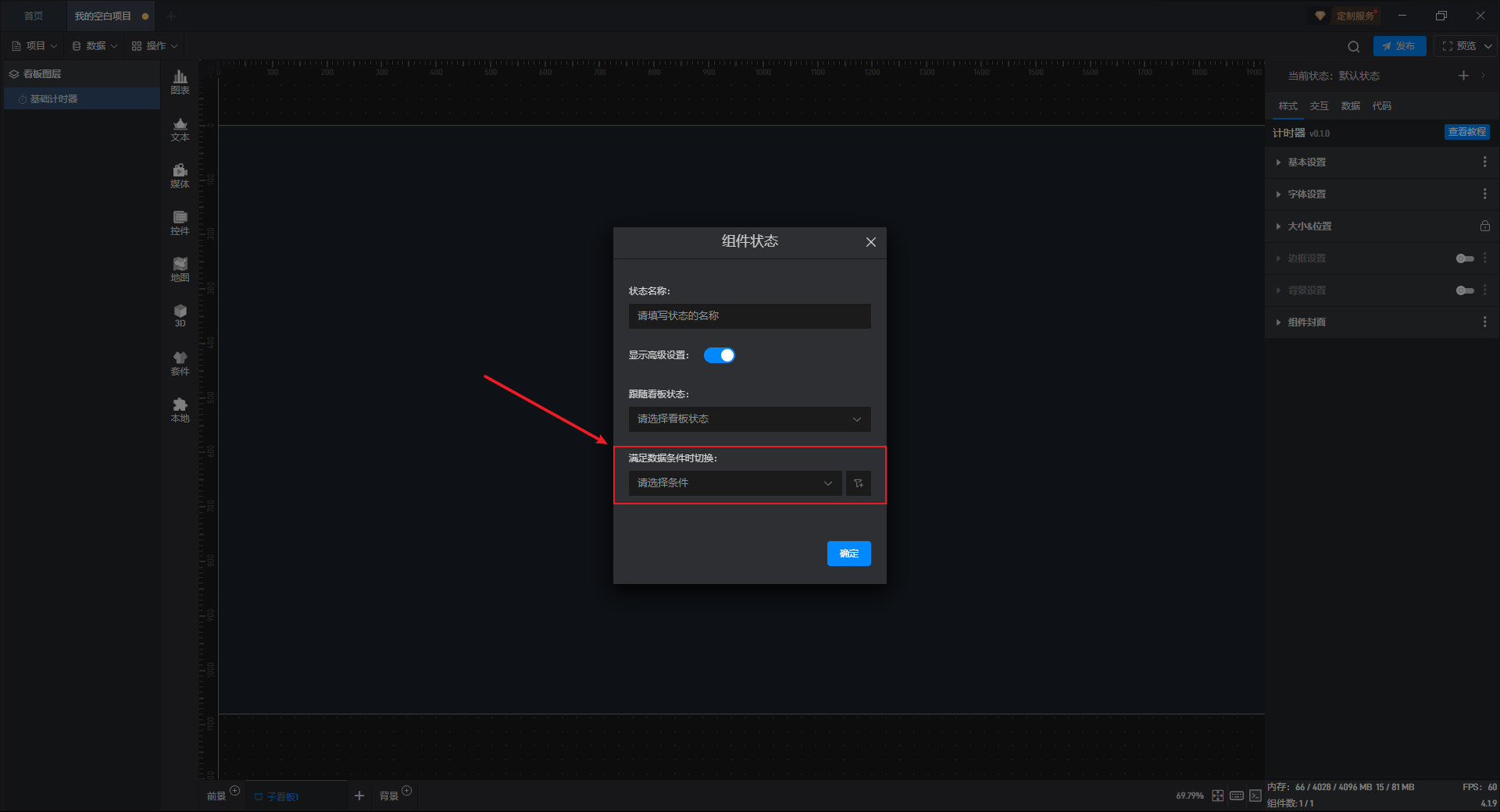 在这里我们可以选择已设置的数据条件,从而在数据条件满足时,组件的状态就会发生变化。