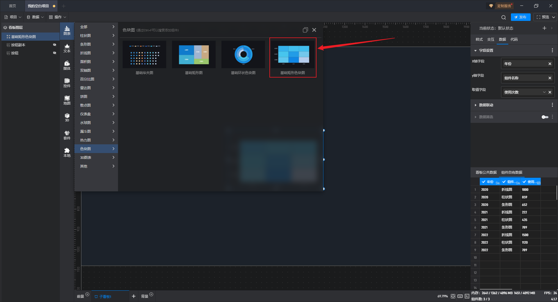 这种数据类型是一个 X 轴字段、一个 Y 轴字段和一个取值字段,一个 Y 轴字段对应一个色块。