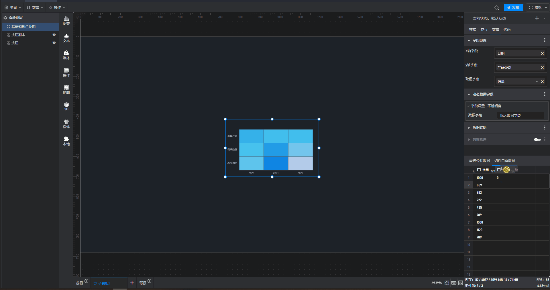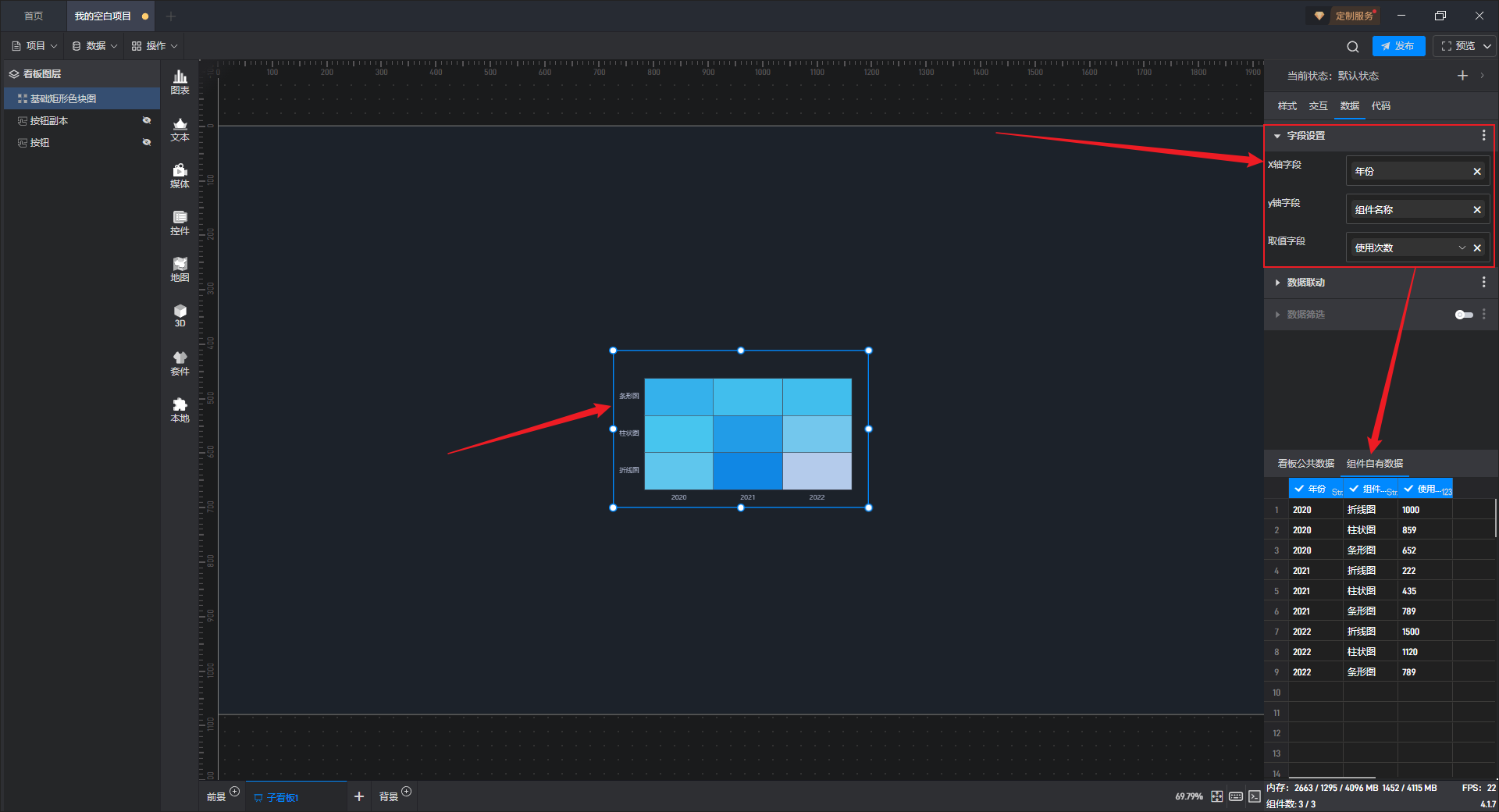 其中 X 轴字段和 Y 轴字段是字符串类型,取值字段是数字类型。