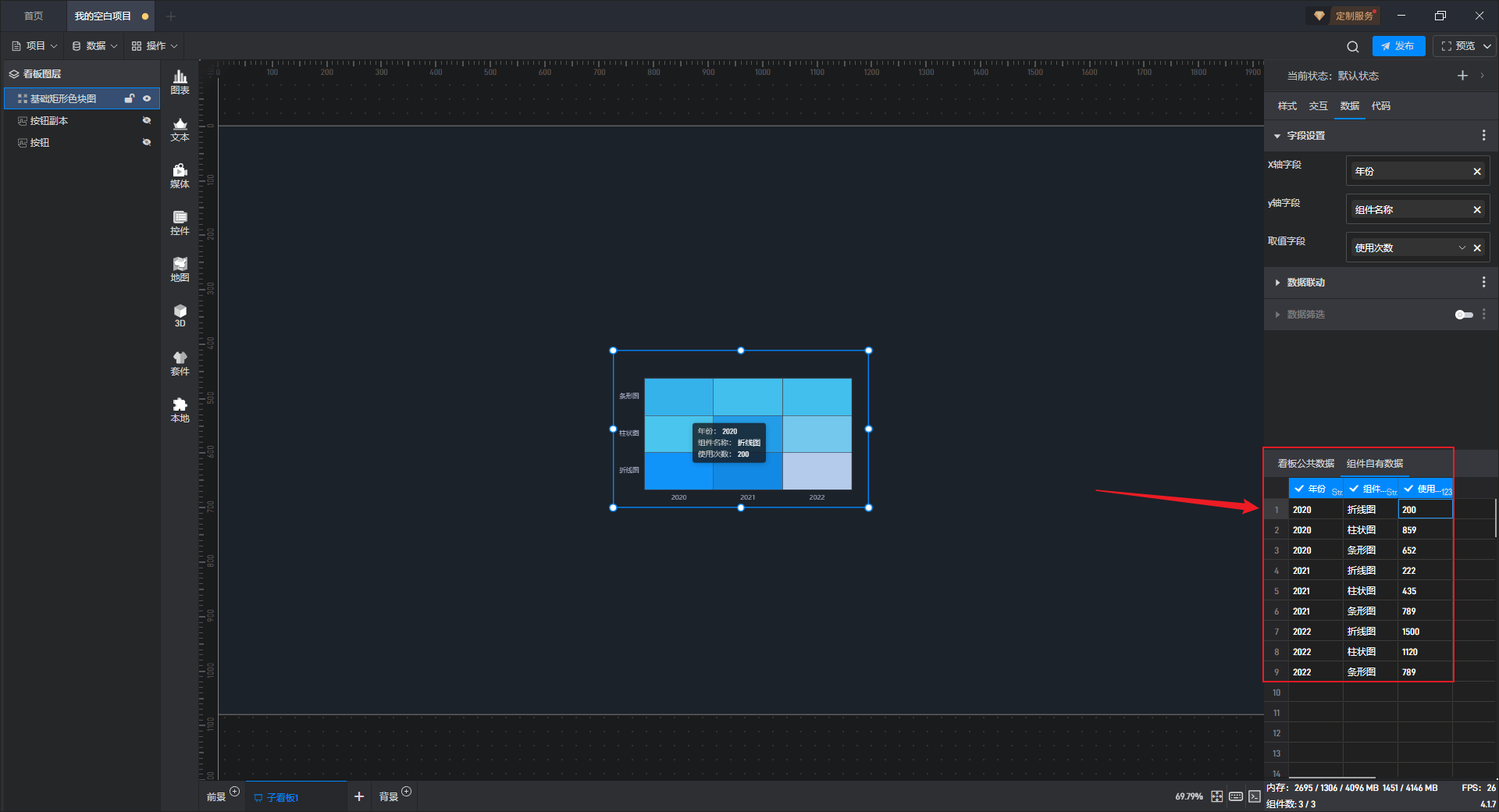 在“数据”设置界面下方可以直接修改数据,组件中的数据也会实时更新。