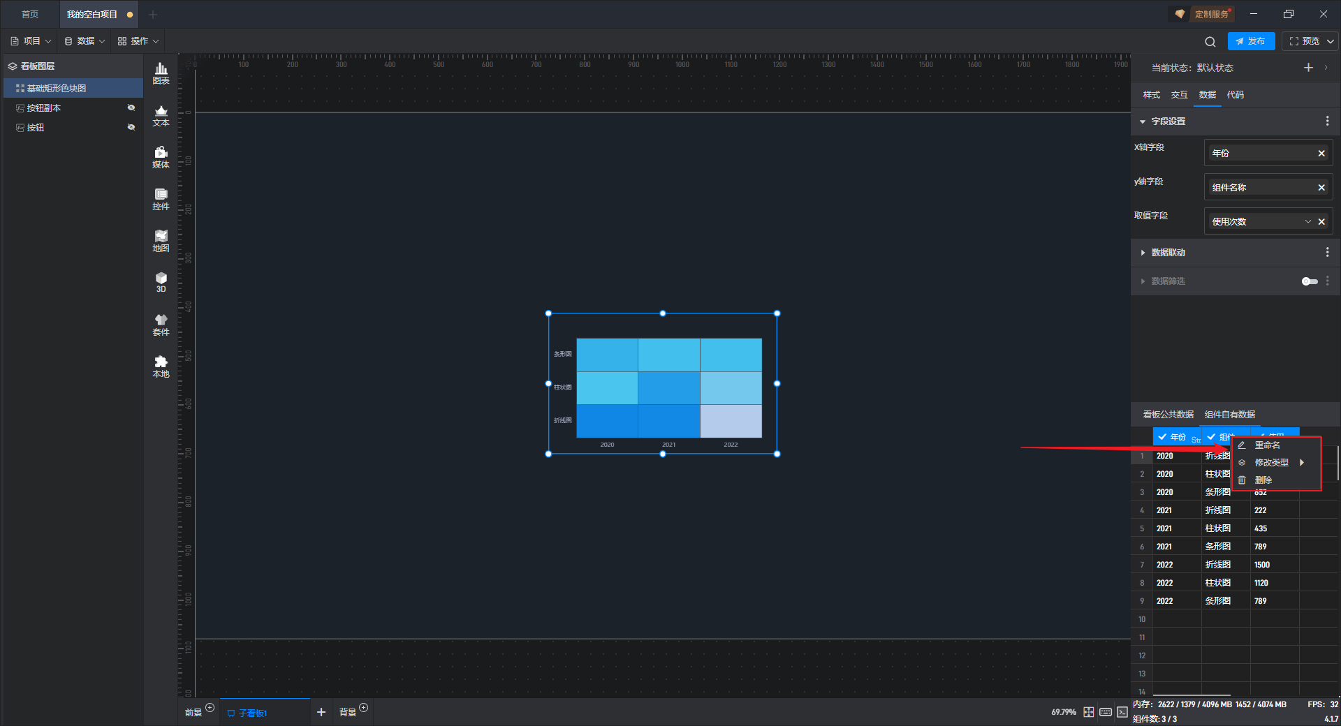 字段类型包括:字符串、数字和数组(X 轴字段和系列字段都是字符串类型,Y 轴是数字类型,数组类型用于词云组件),只有在字段类型正确的情况下,组件内容才能正常显示。