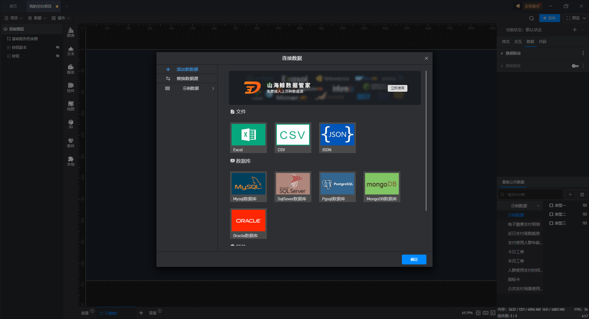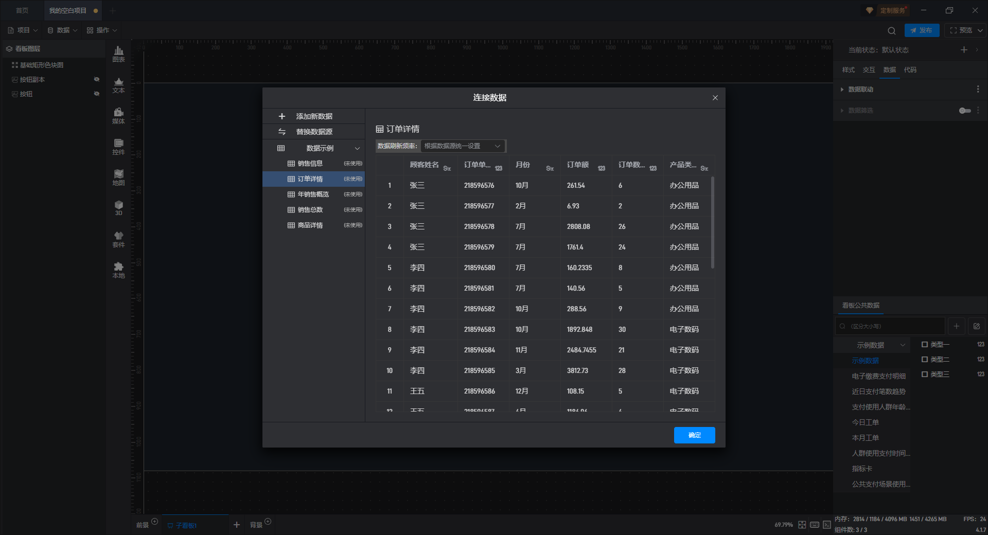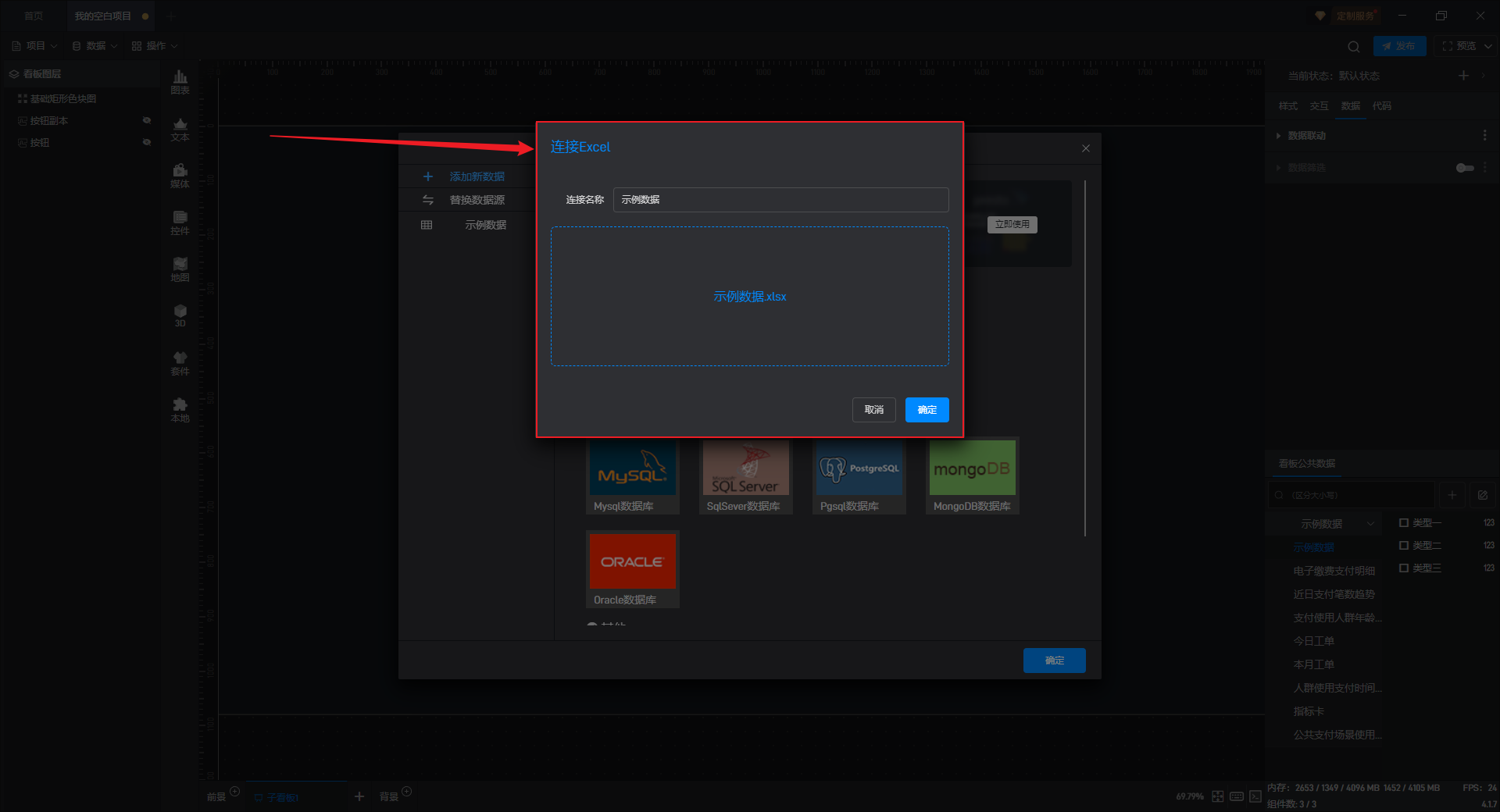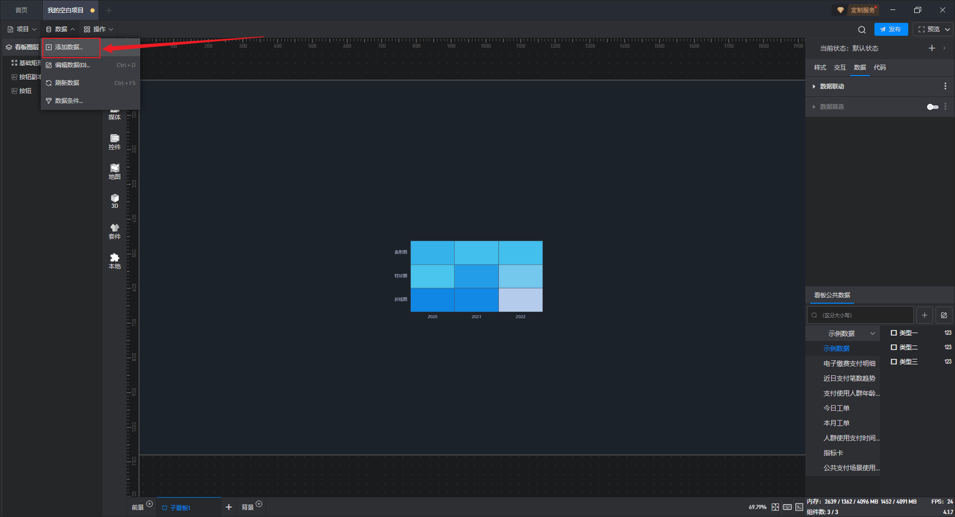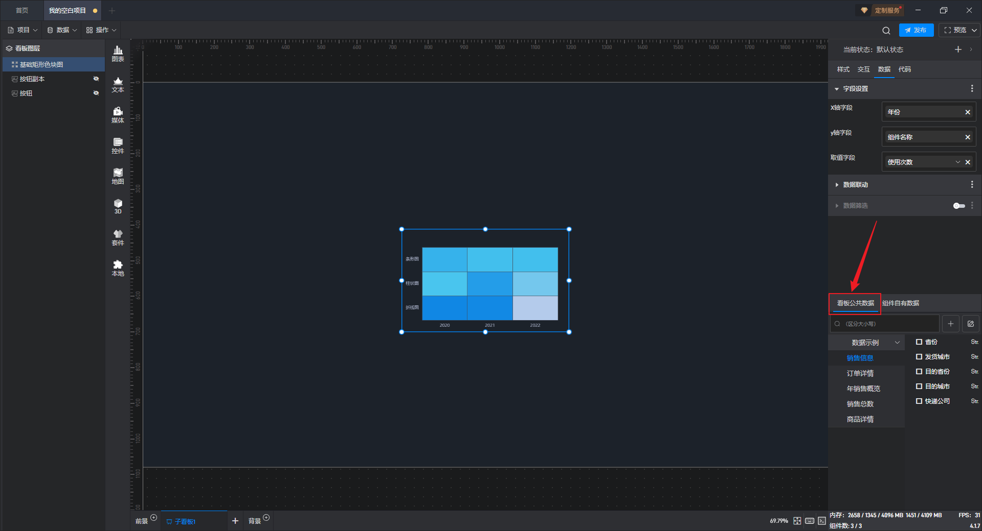 点击选中组件,在右侧“数据”设置窗口中切换到“看板公共数据”(同一个项目中所有数据源是共享的)。