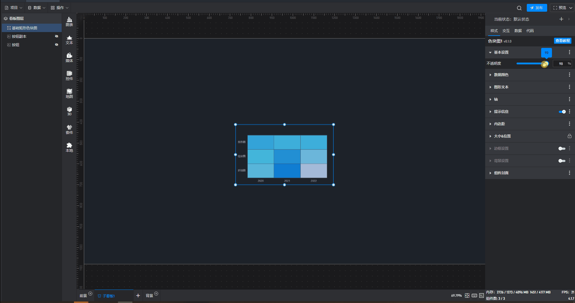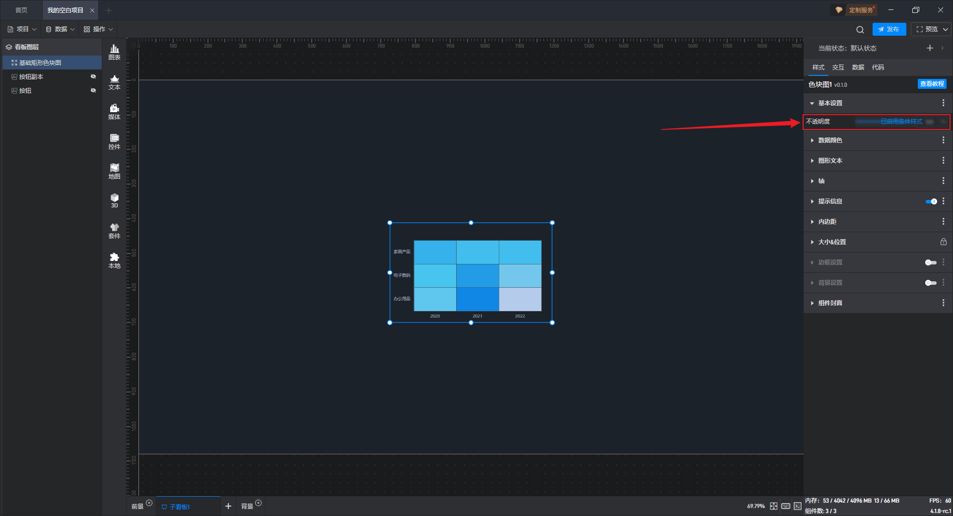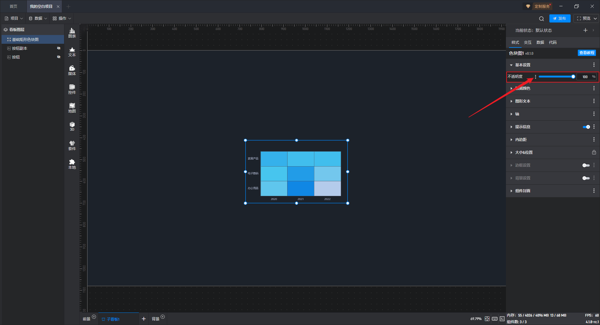 | 不透明度 | 1)根据个人喜好或整体和谐度合理地使用透明度,会让大屏布局更美观; | 2)这个设置项的一个常见用法是结合条件样式/交互/多状态来实现组件的显示和隐藏。 |