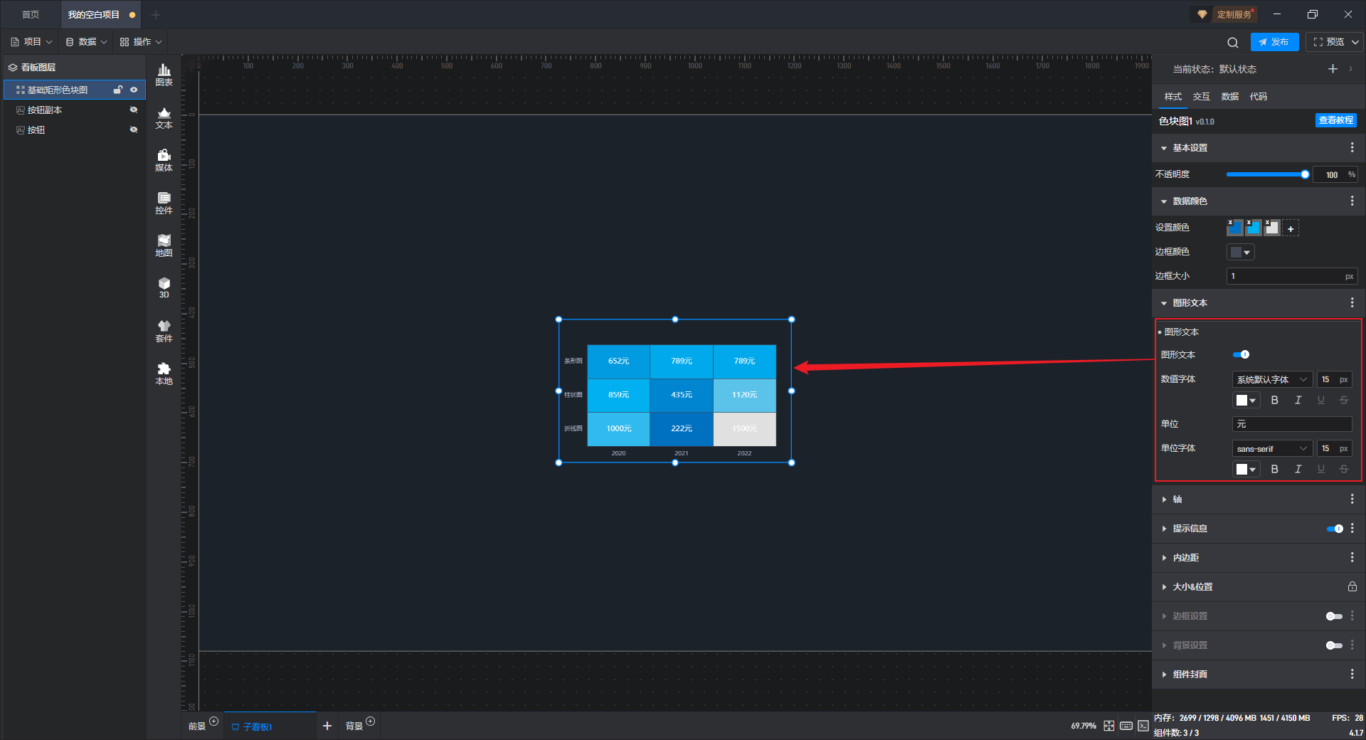 开启“图形文本”按钮后,组件中才能显示图形文字。