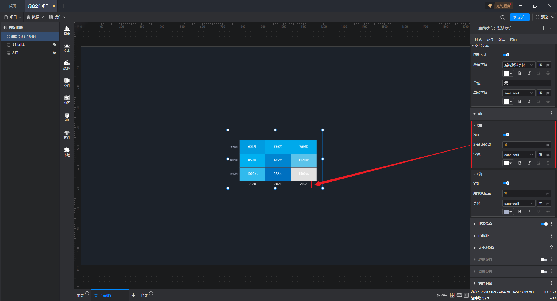 启用 Y 轴后,Y 轴的样式才会显示在组件中。