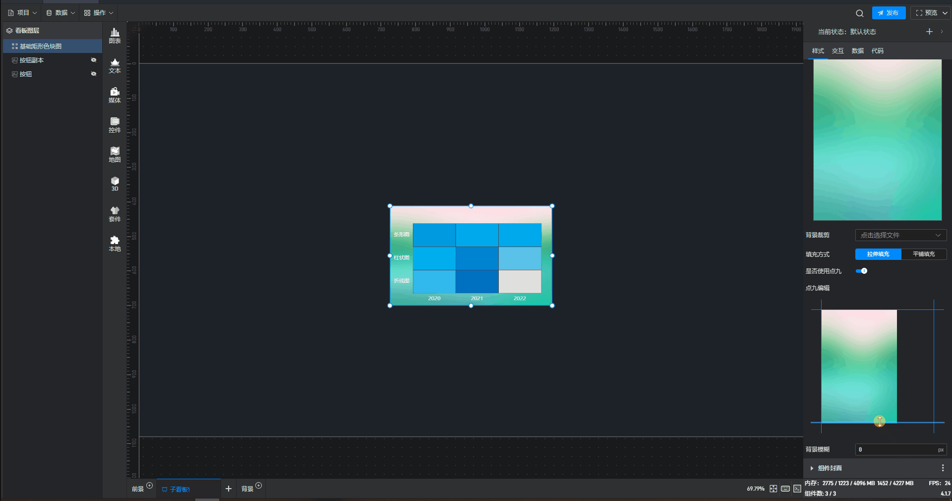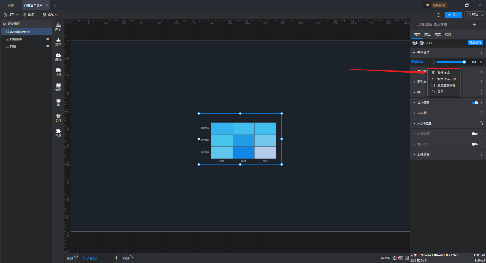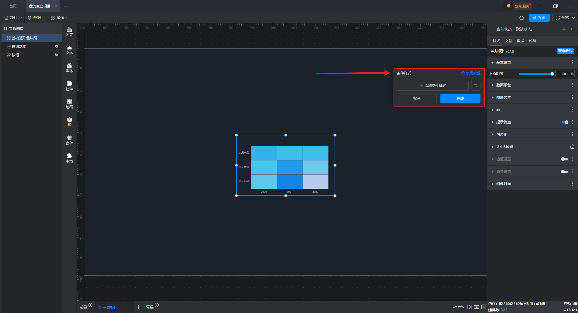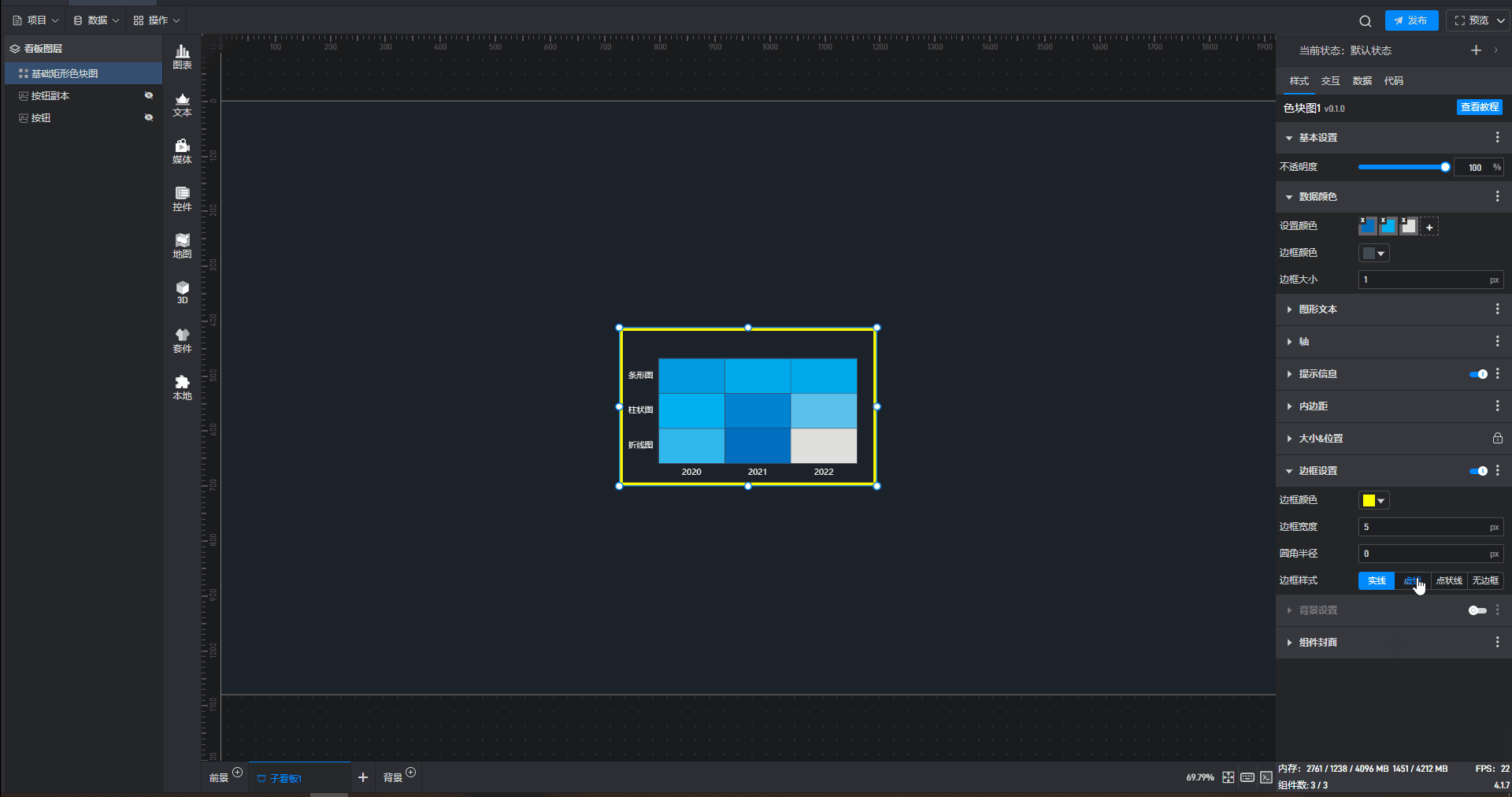 所谓固定样式,就是设置完之后一直保持的组件样式,这是和 3.2 章节中的条件样式相对应的,条件样式就是根据数据的变化改变组件的样式。