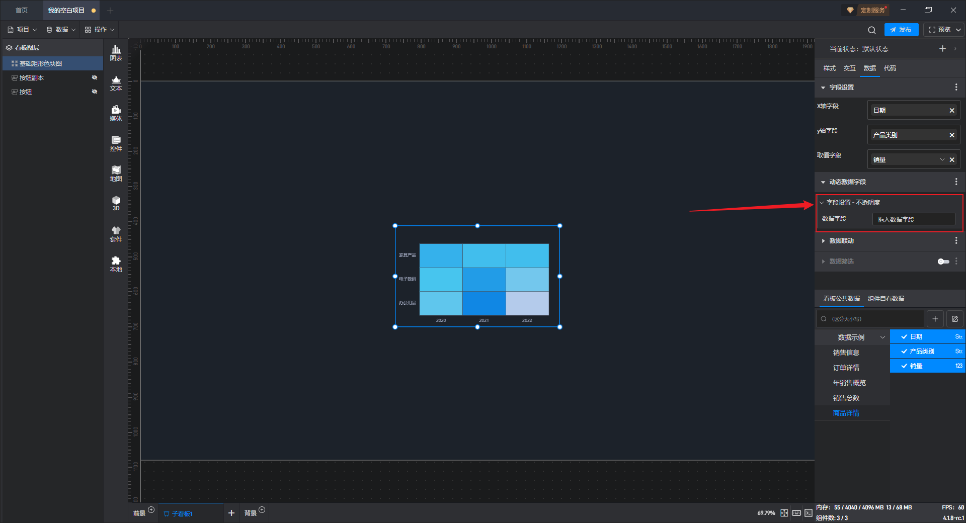 接下来只需要添加一个数据字段到这里,就可以通过数据来控制不透明度了。