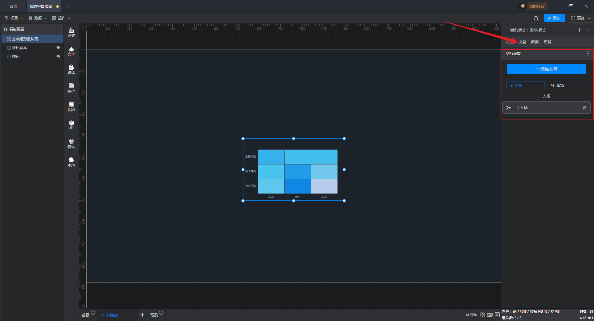 点击选中组件,在右侧“交互”设置窗口中可以对当前组件的交互进行添加和删除。