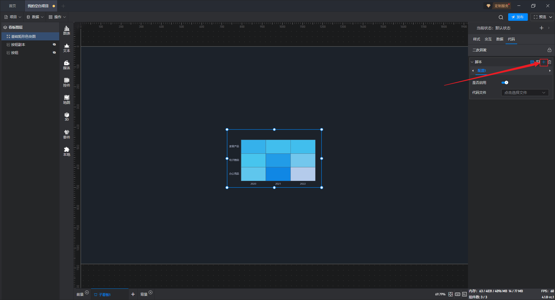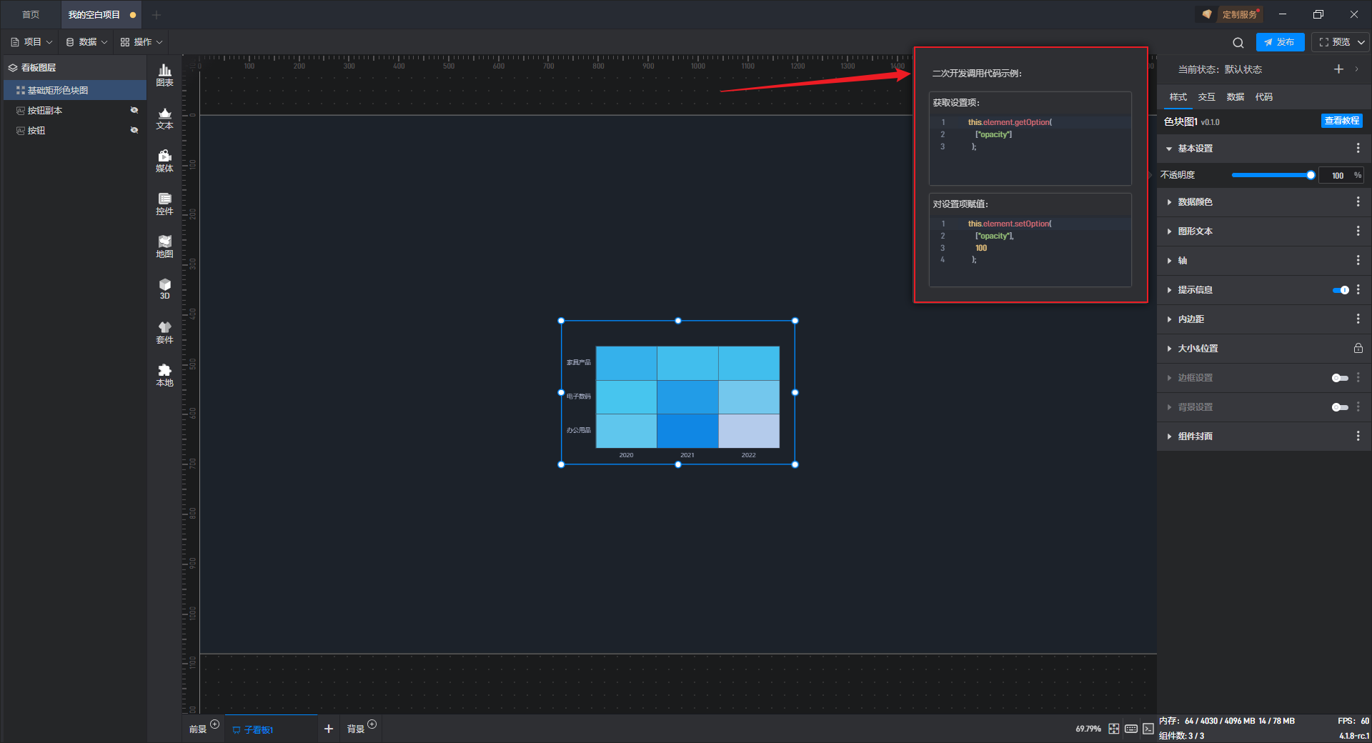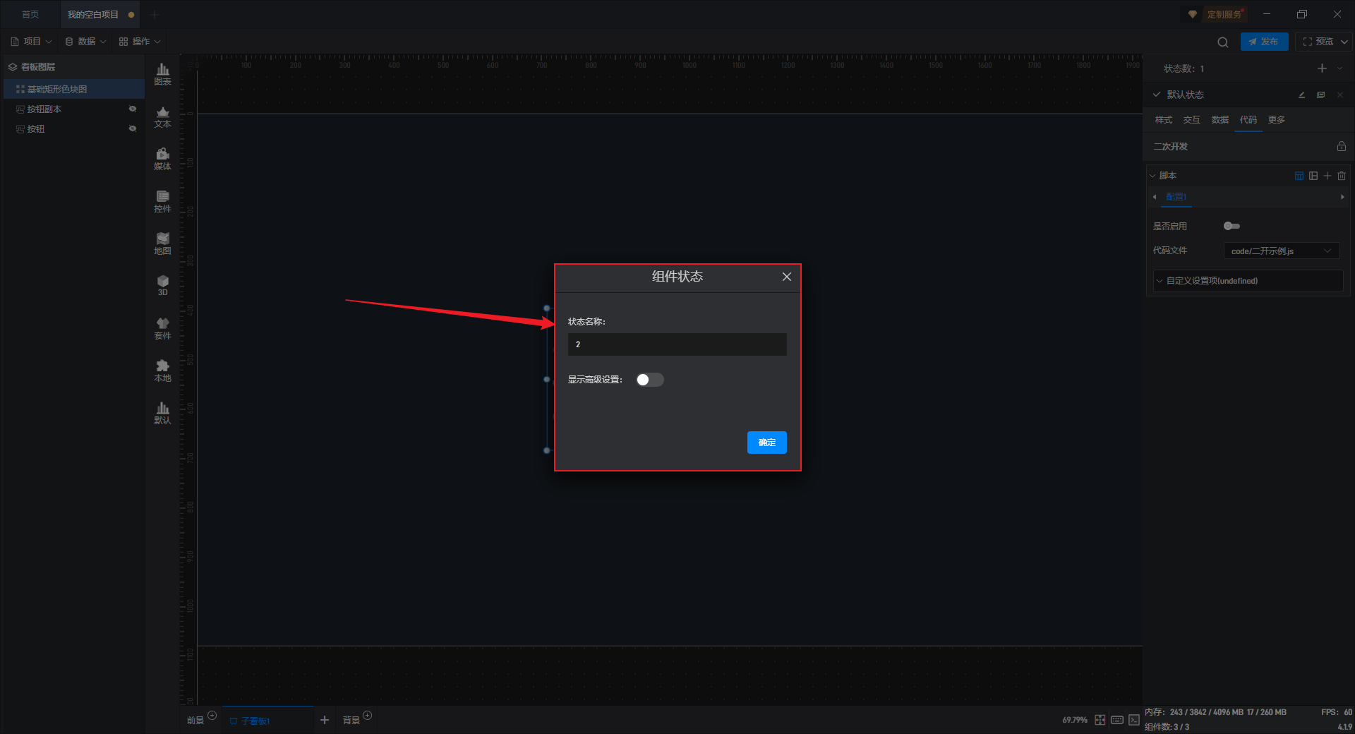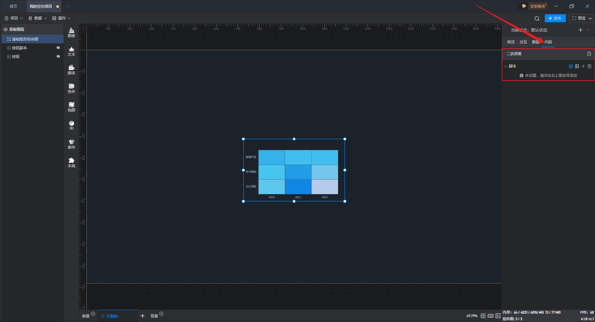 点击选中组件,在右侧“代码”设置窗口中可以对组件进行二次开发设置。