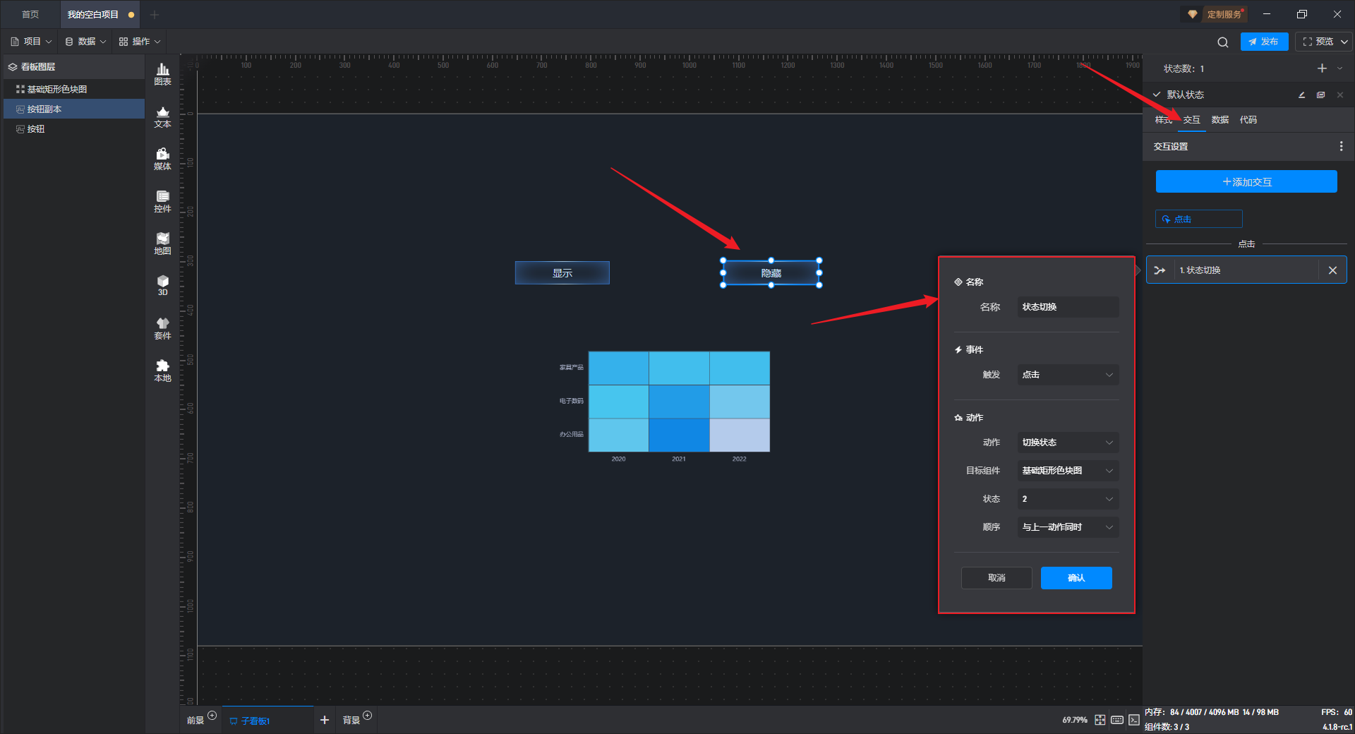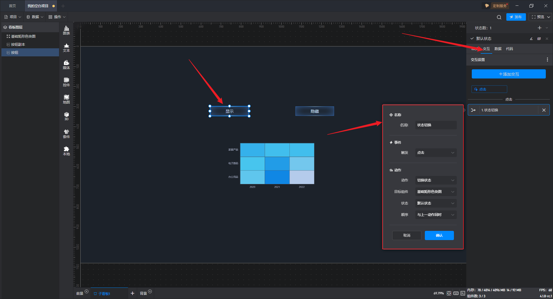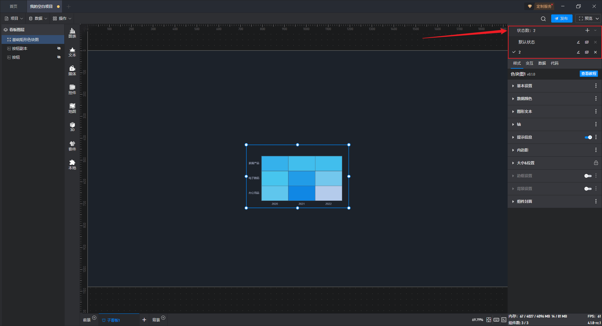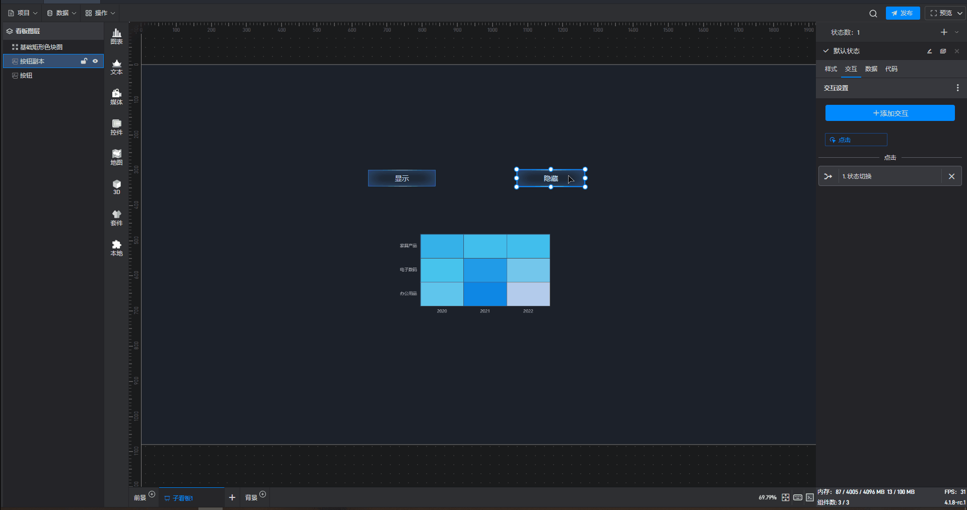 多状态主要用于通过数据条件或是点击交互(通常是点击其他组件来触发本组件的状态切换)来切换组件设置项的场景,这里的设置项包括组件的样式、交互、数据和代码。