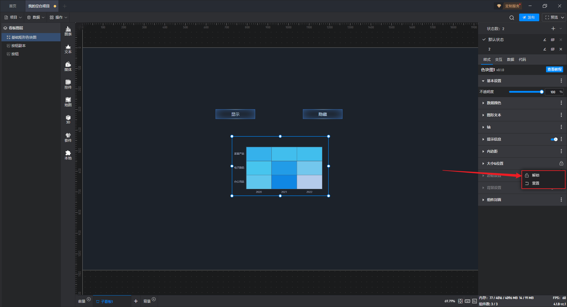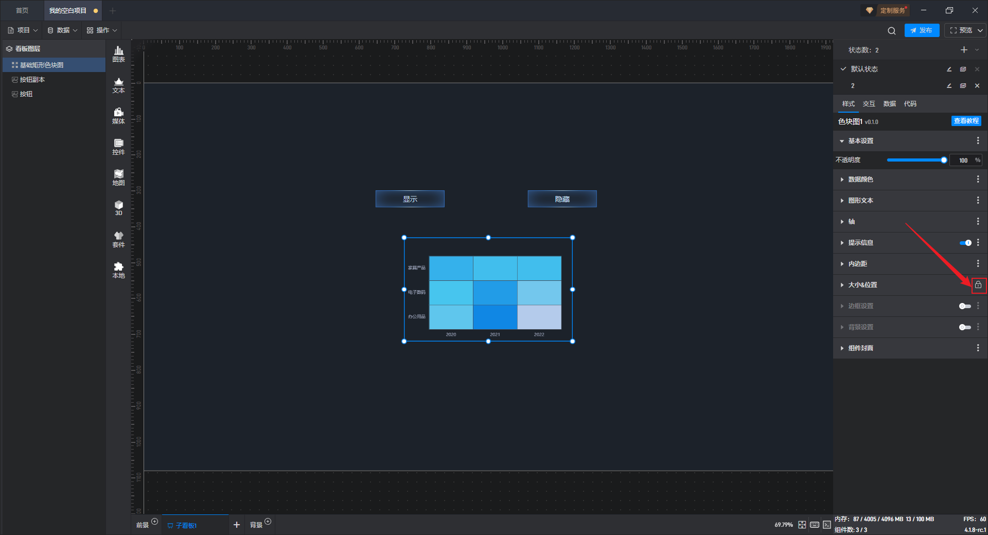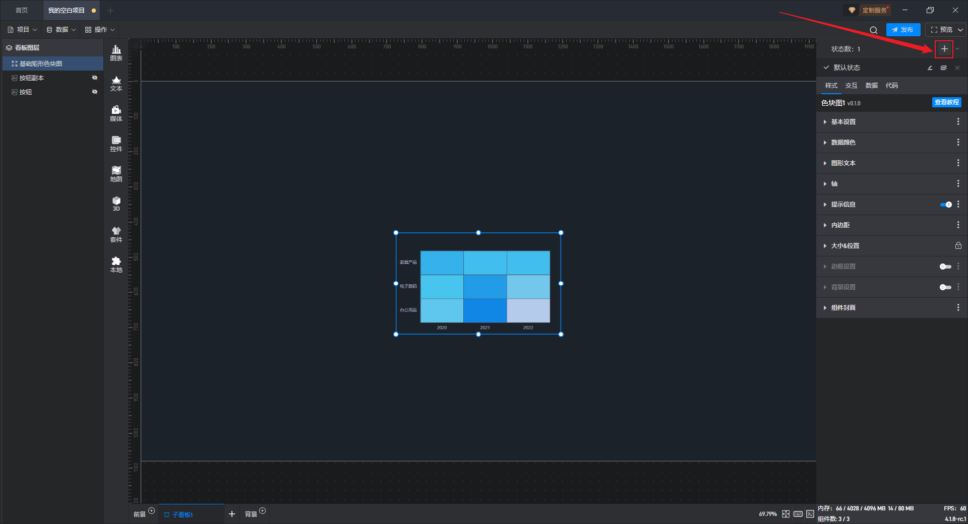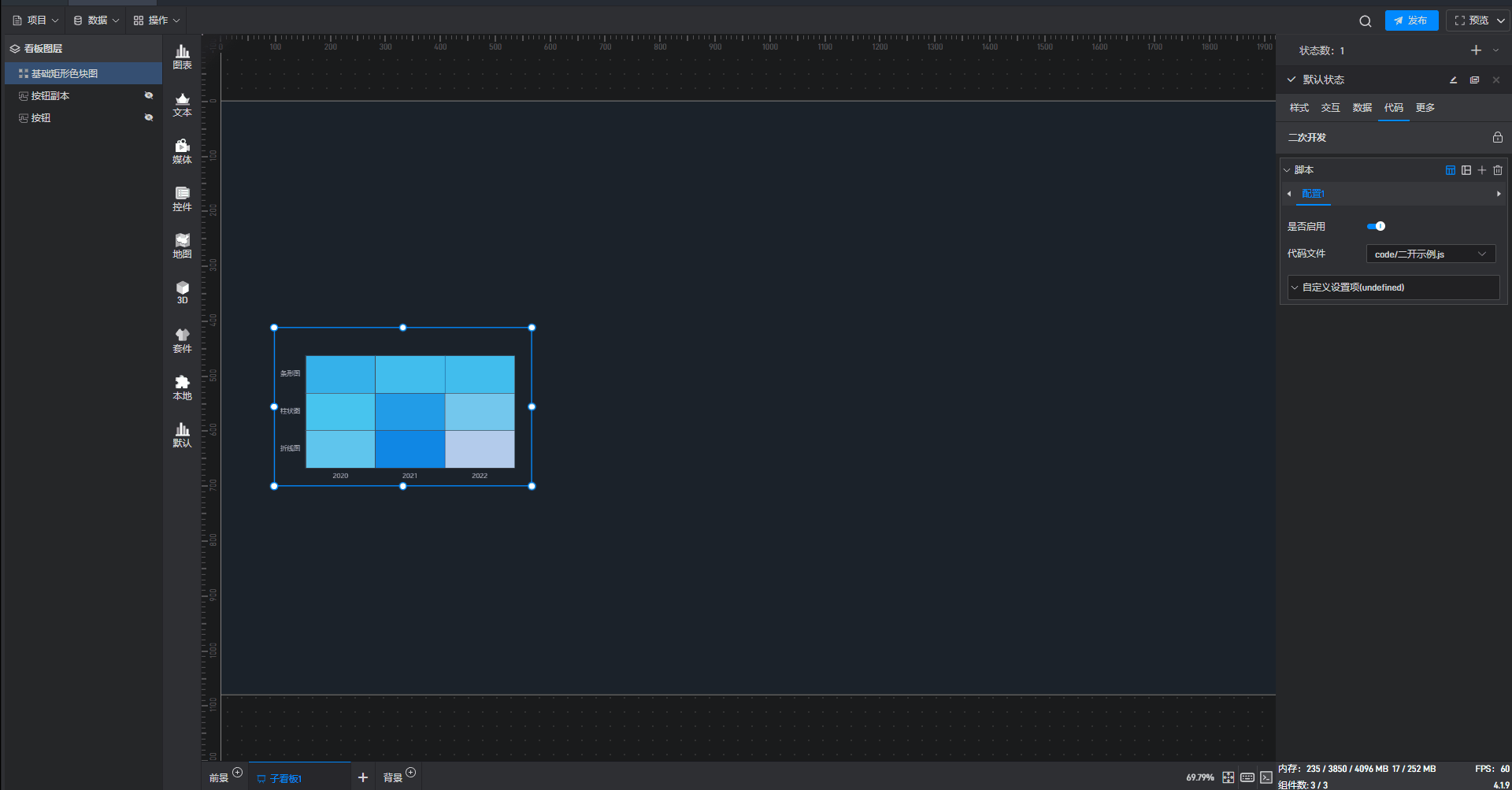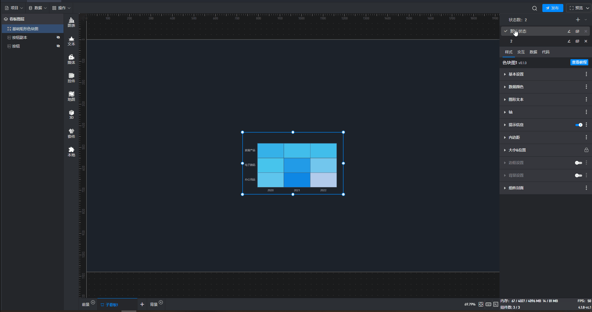 多状态主要用于通过数据条件或是点击交互(通常是点击其他组件来触发本组件的状态切换)来切换组件设置项的场景,这里的设置项包括组件的样式、交互、数据和代码。