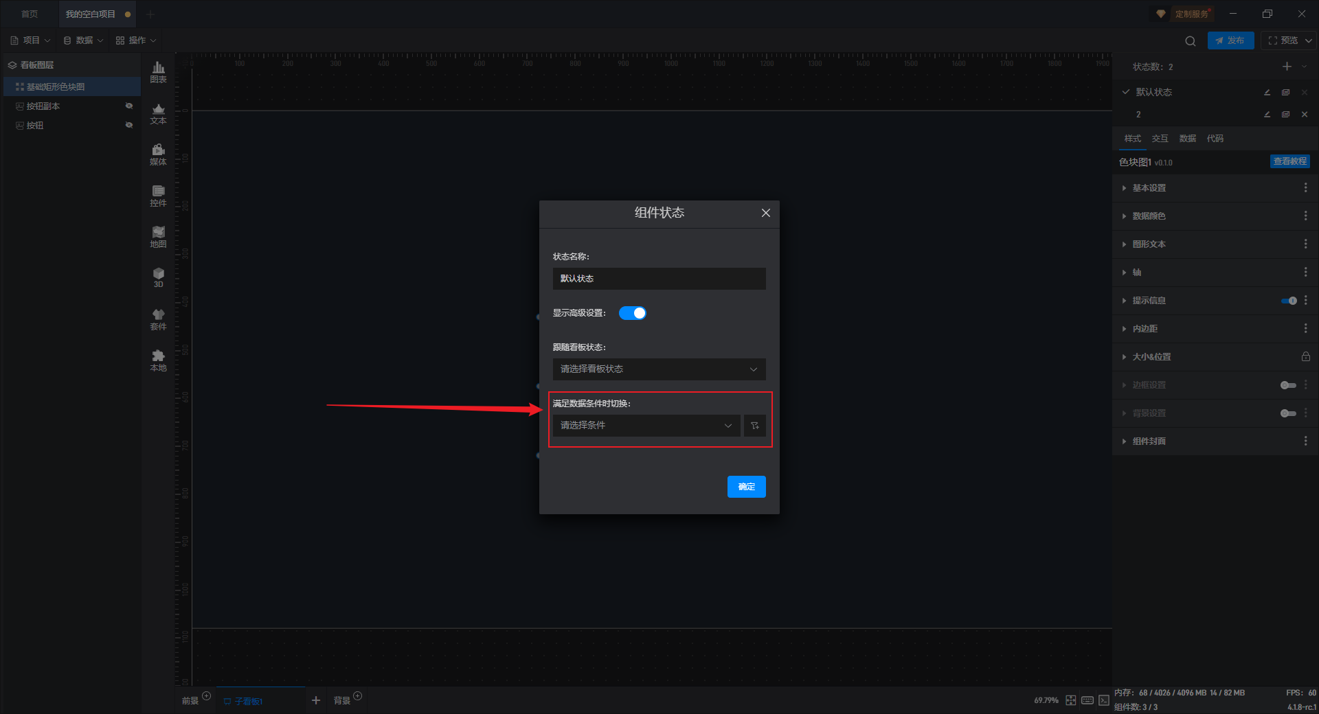在这里我们可以选择已设置的数据条件,从而在数据条件满足时,组件的状态就会发生变化。