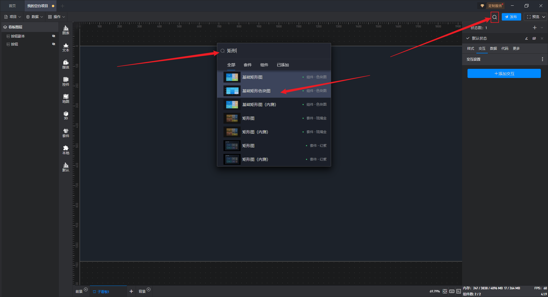 点击搜索按钮或按键盘“Ctrl+F”键打开搜索框,输入组件名称进行搜索,然后点击对应的组件进行添加。
