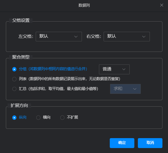 数据列的基本属性包括父格设置、聚合类型和扩展方向三类设置。