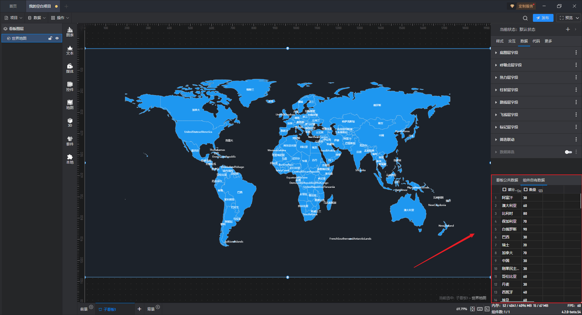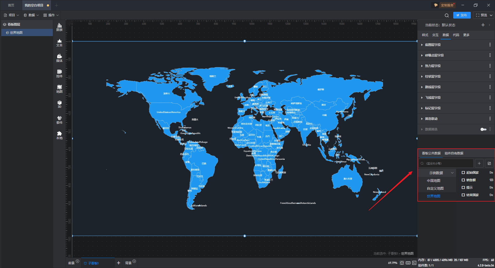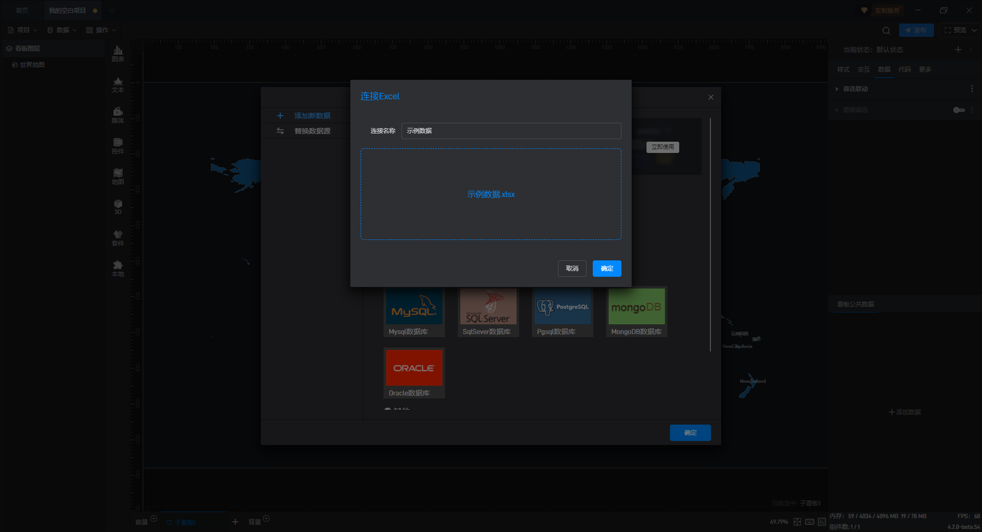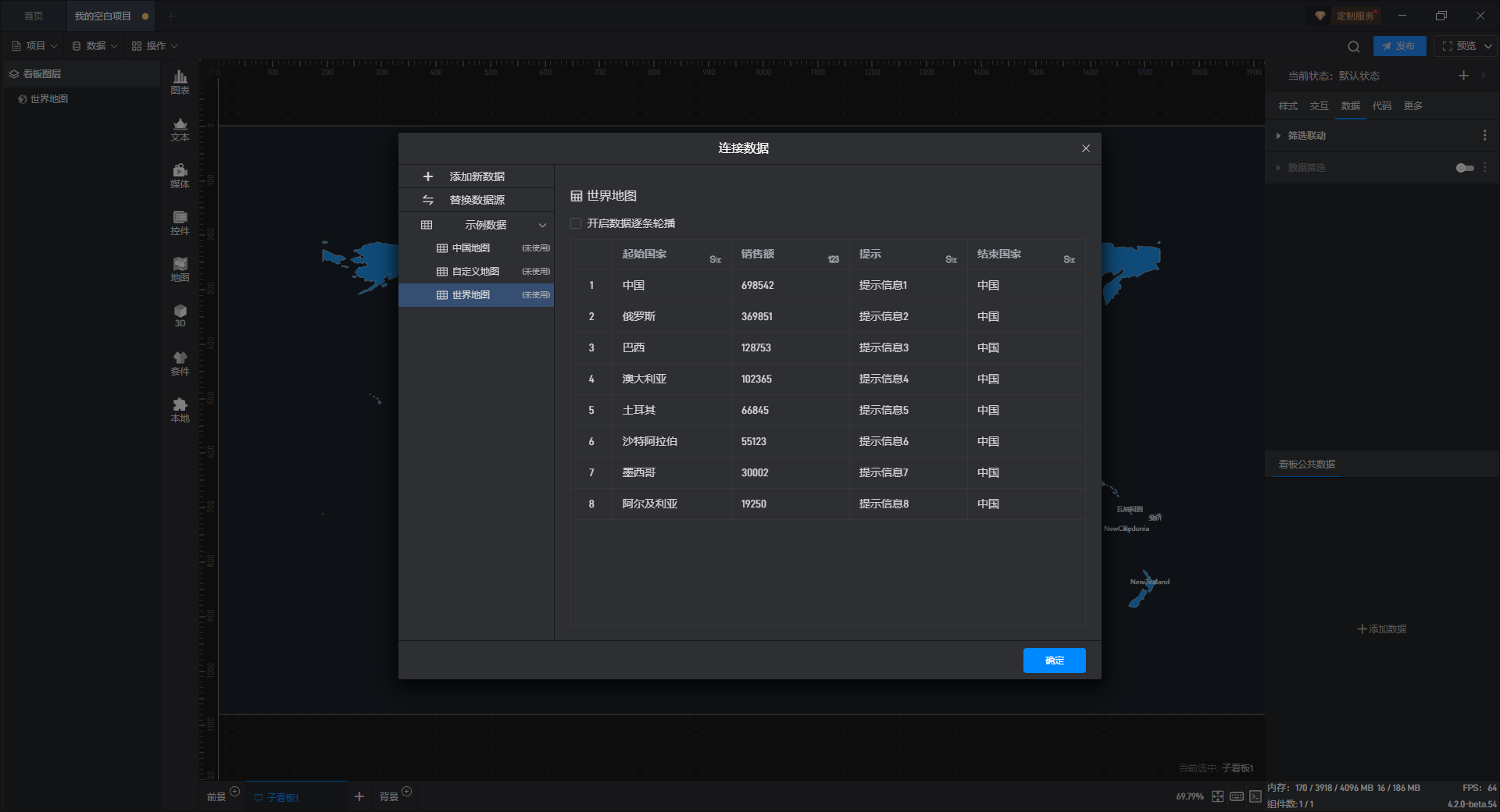 每个组件都自带有一个示例数据源,但世界地图组件需要自行添加本地数据,具体步骤见(2)。