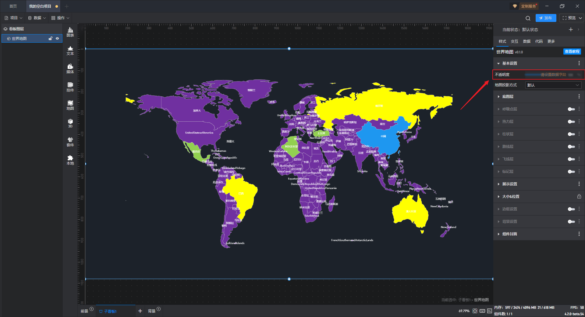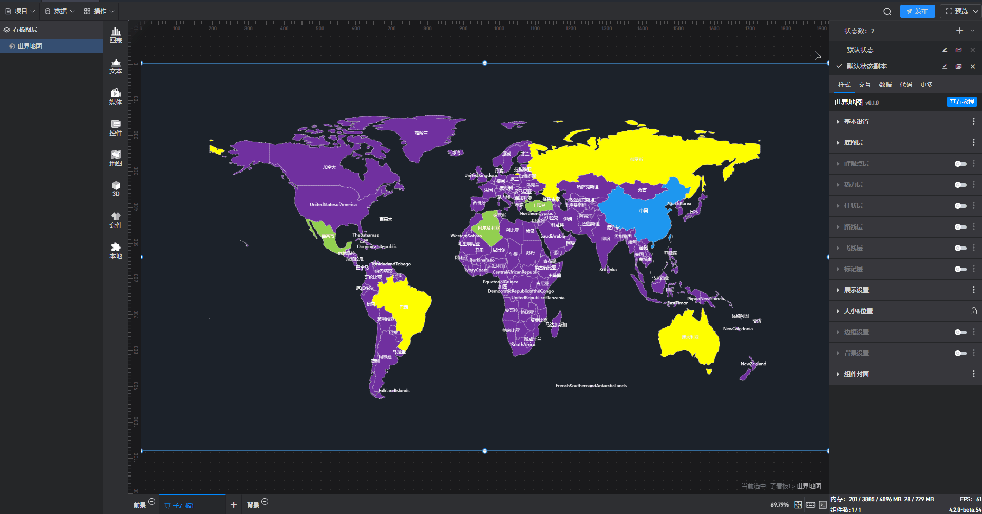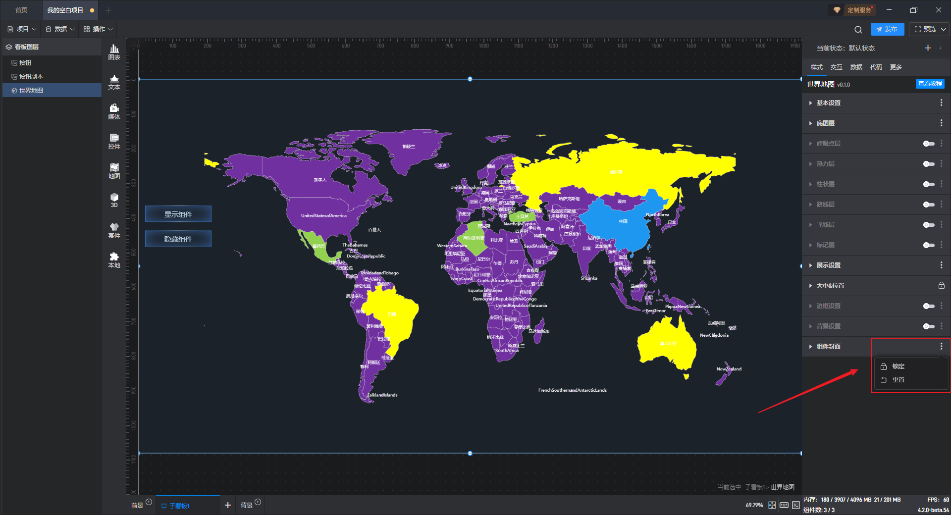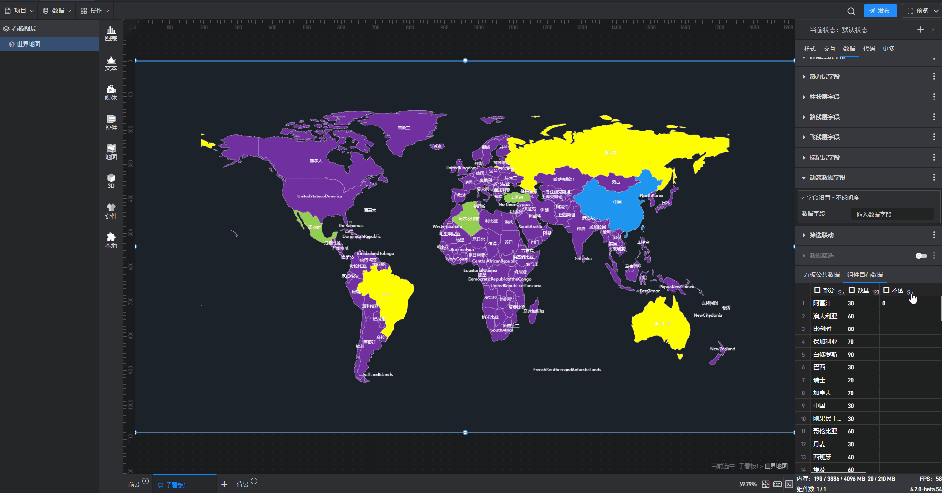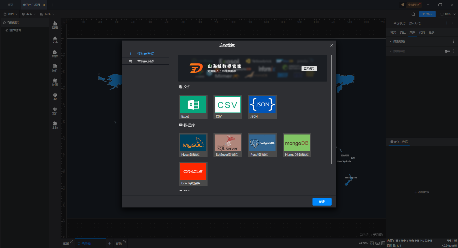 每个组件都自带有一个示例数据源,但世界地图组件需要自行添加本地数据,具体步骤见(2)。