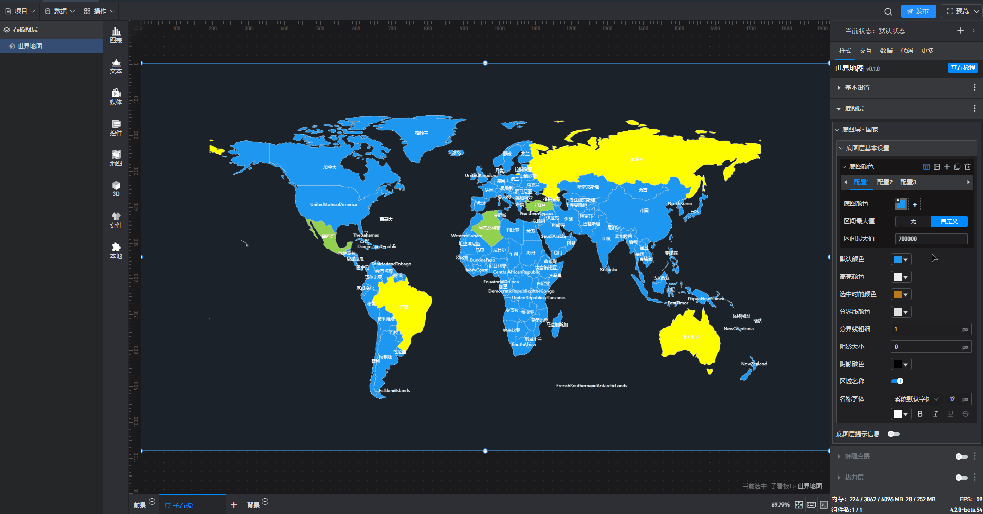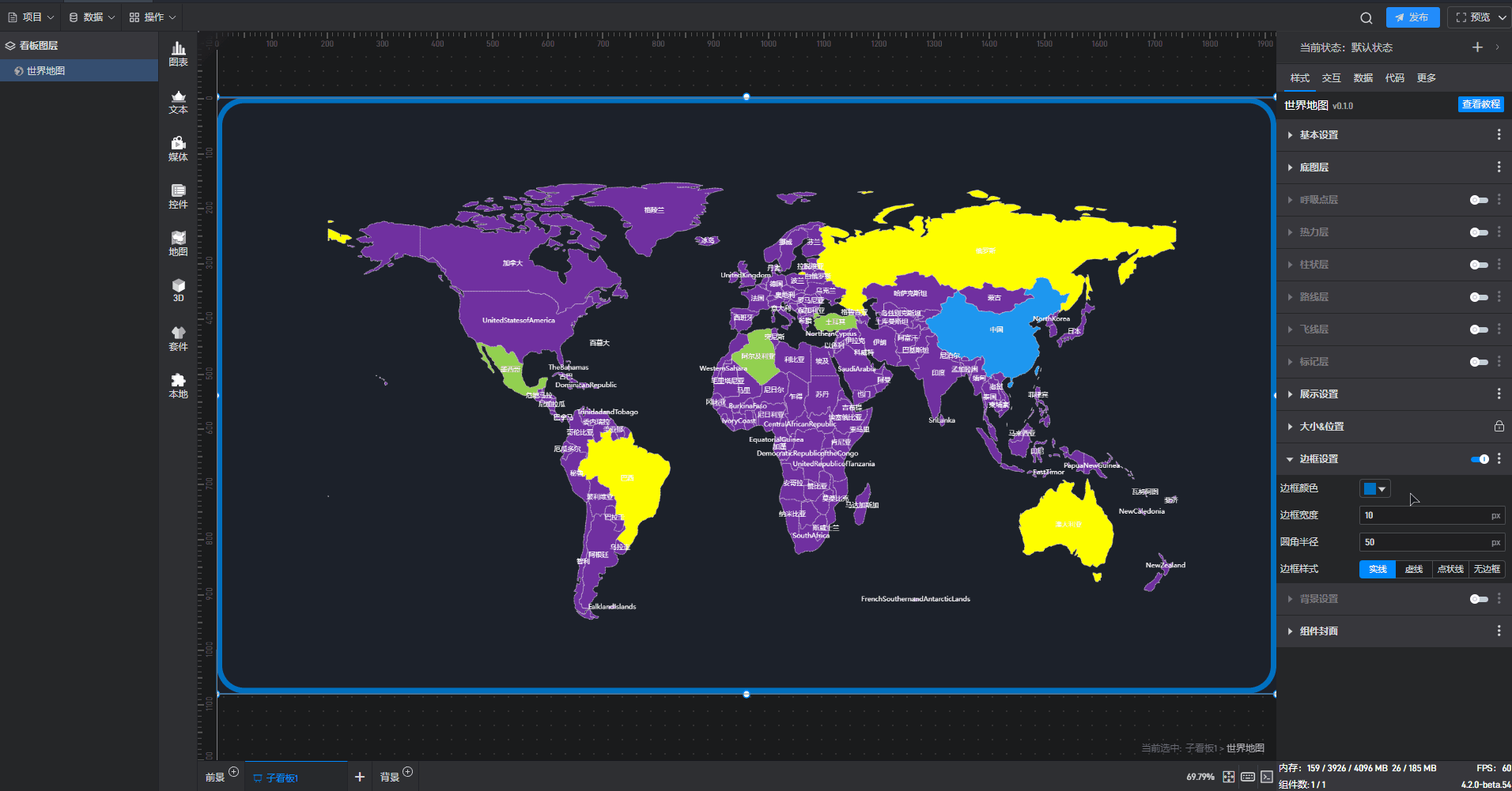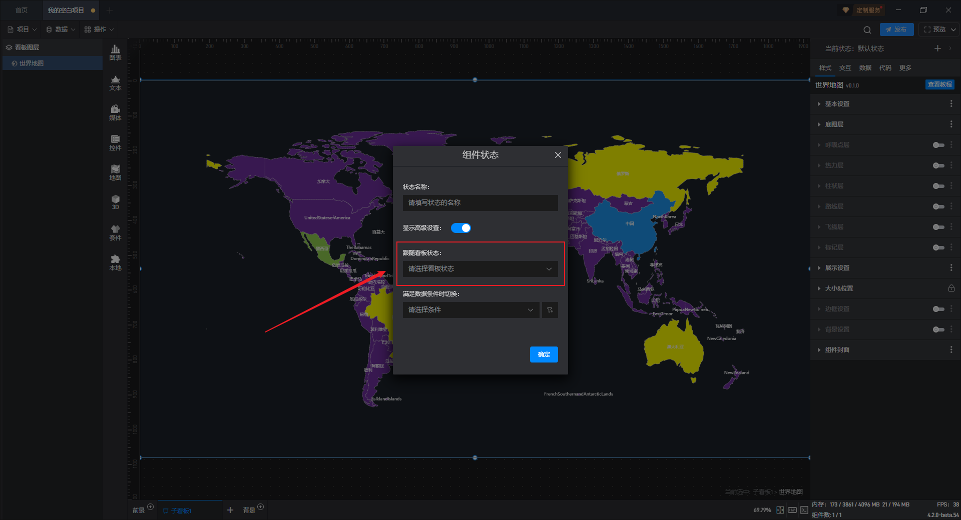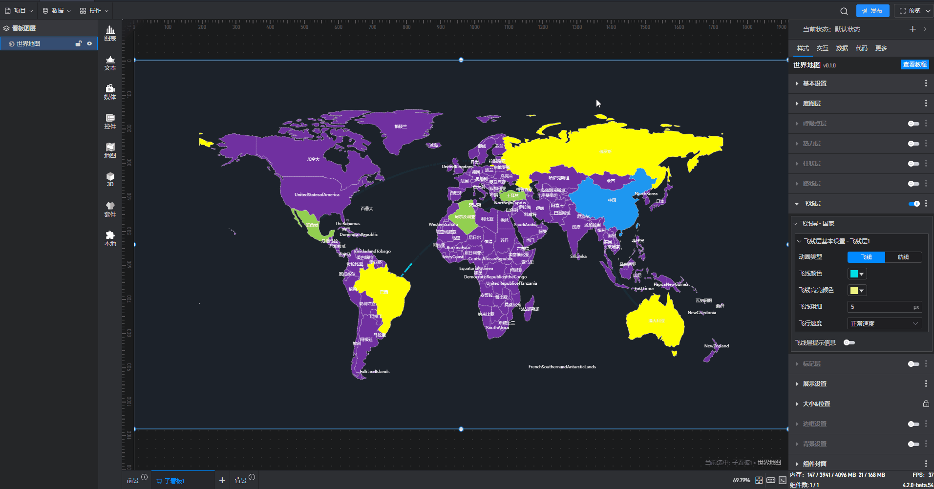 每个组件都自带有一个示例数据源,但世界地图组件需要自行添加本地数据,具体步骤见(2)。