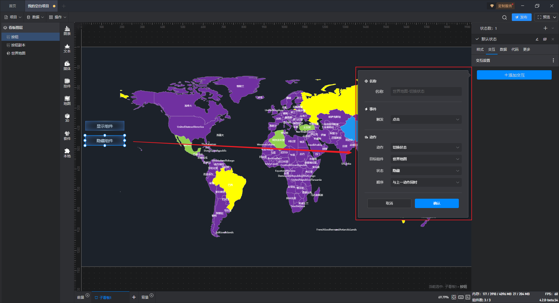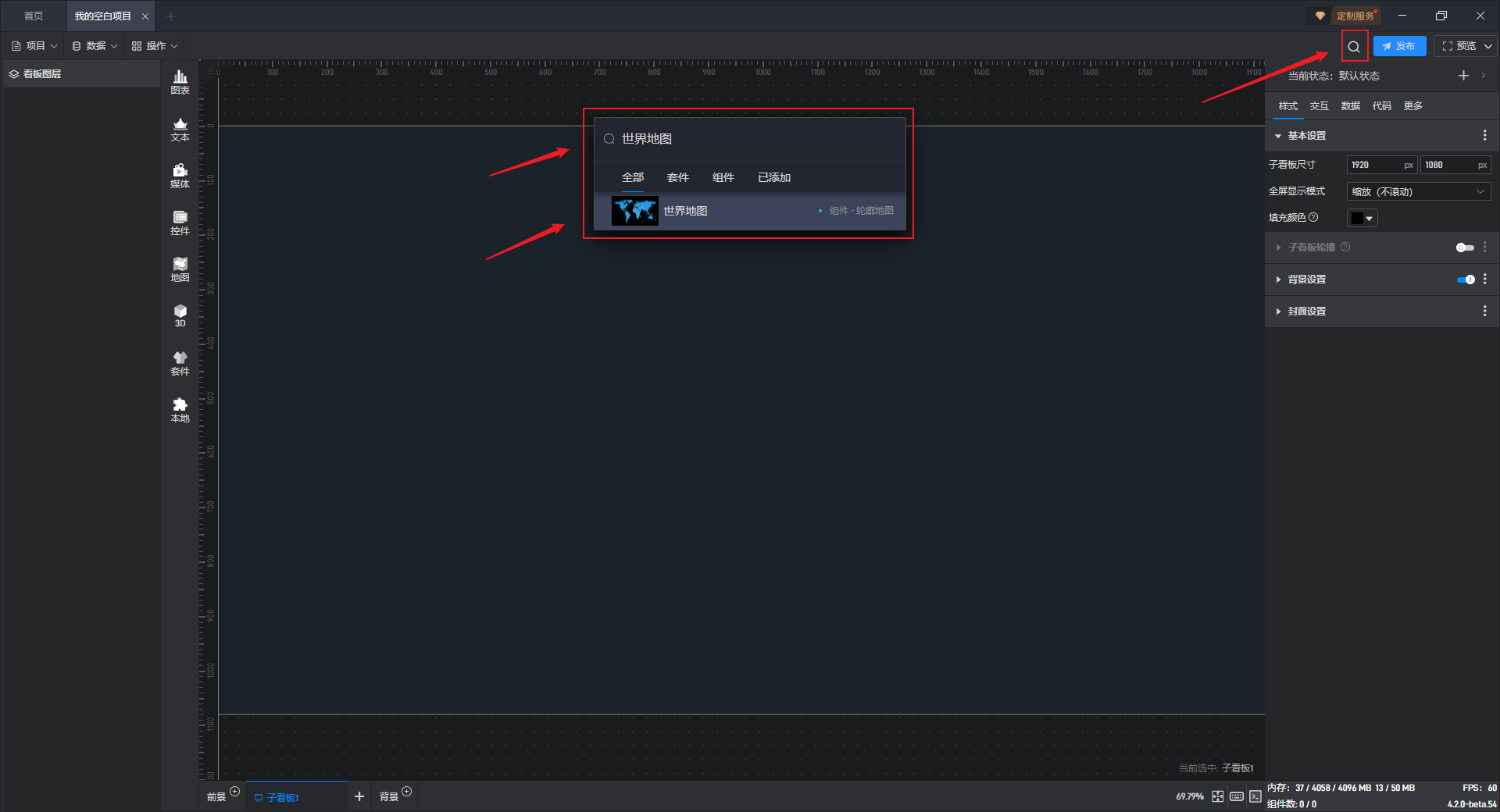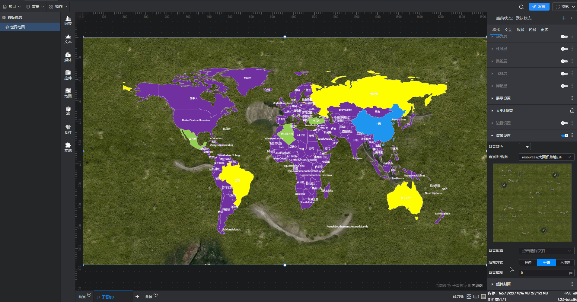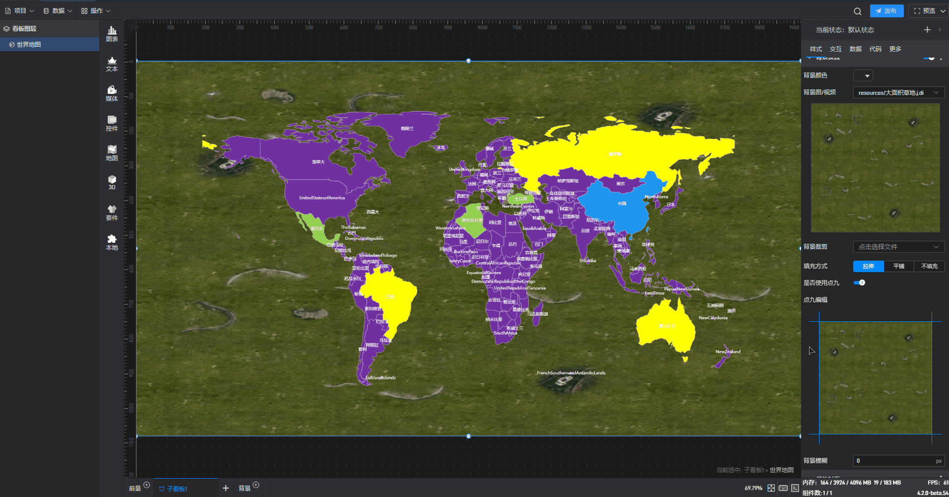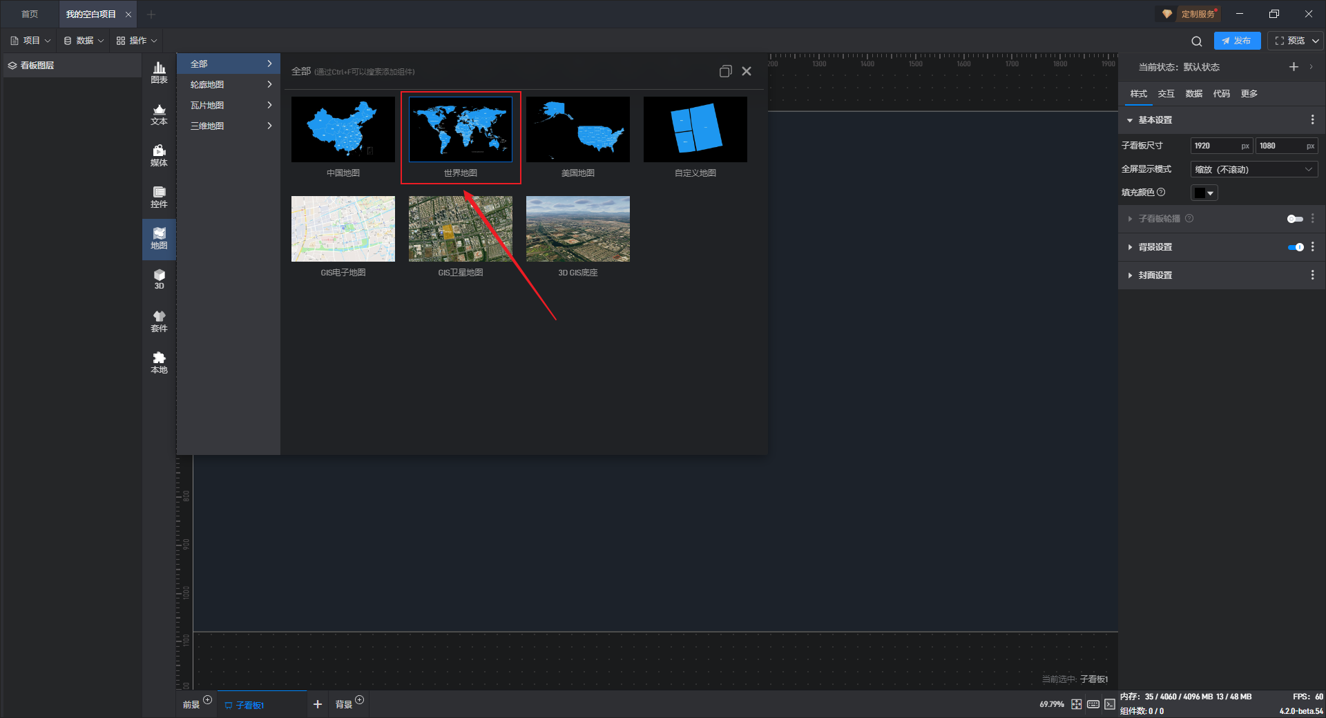 每个组件都自带有一个示例数据源,但世界地图组件需要自行添加本地数据,具体步骤见(2)。