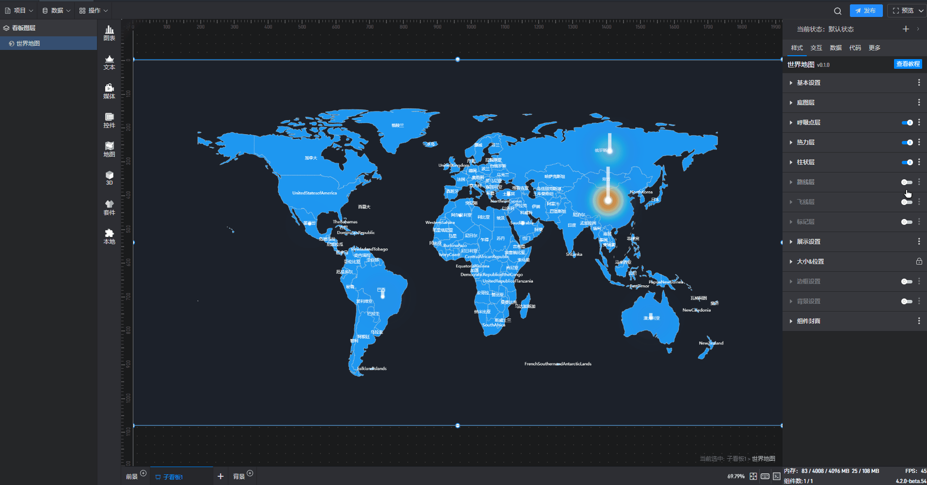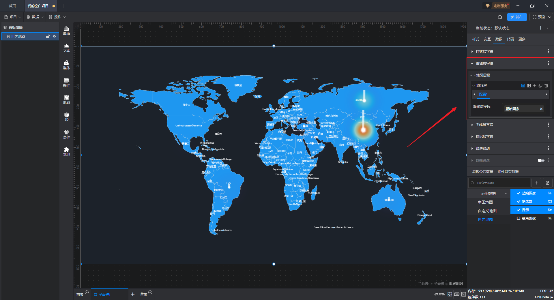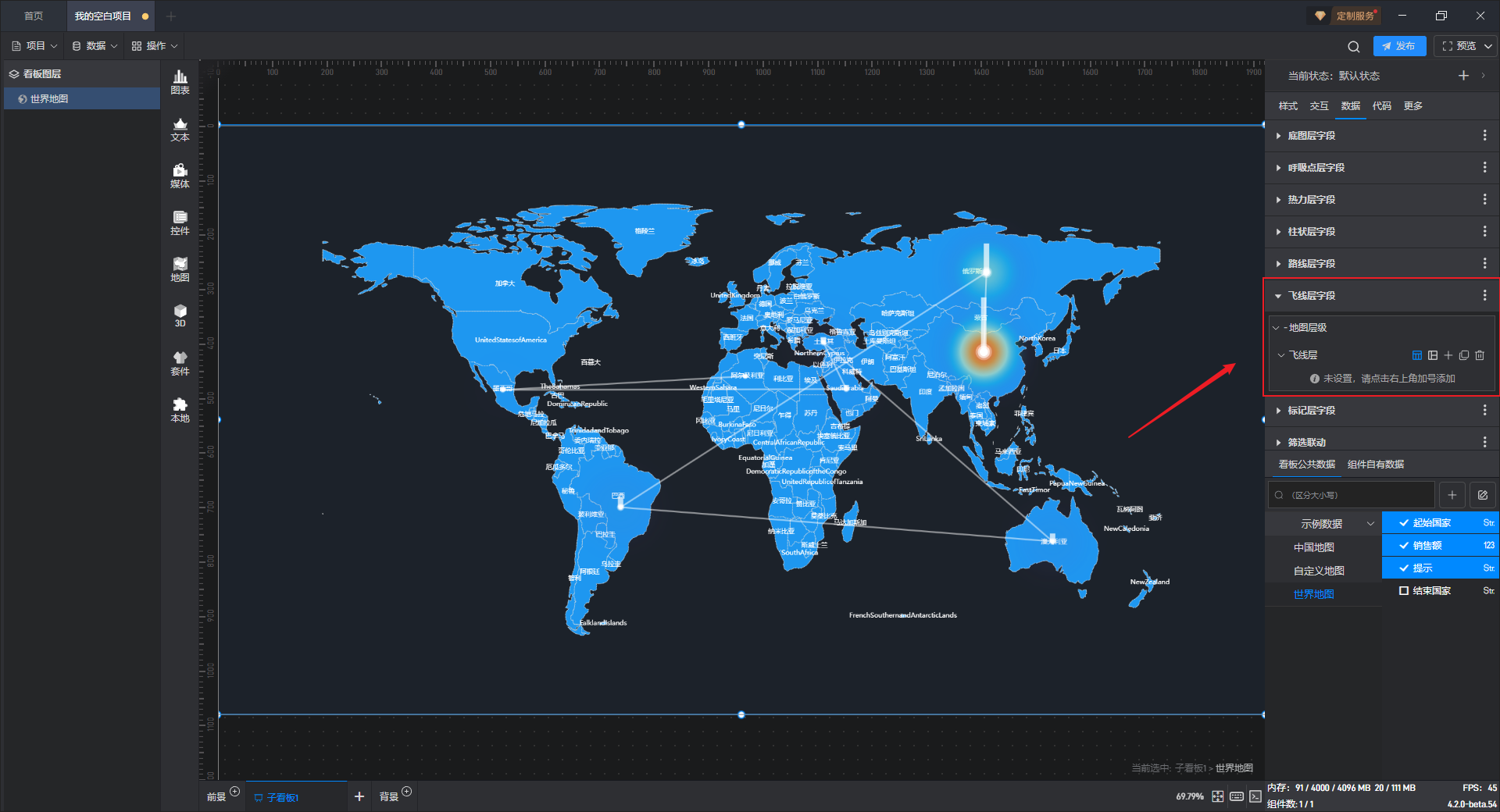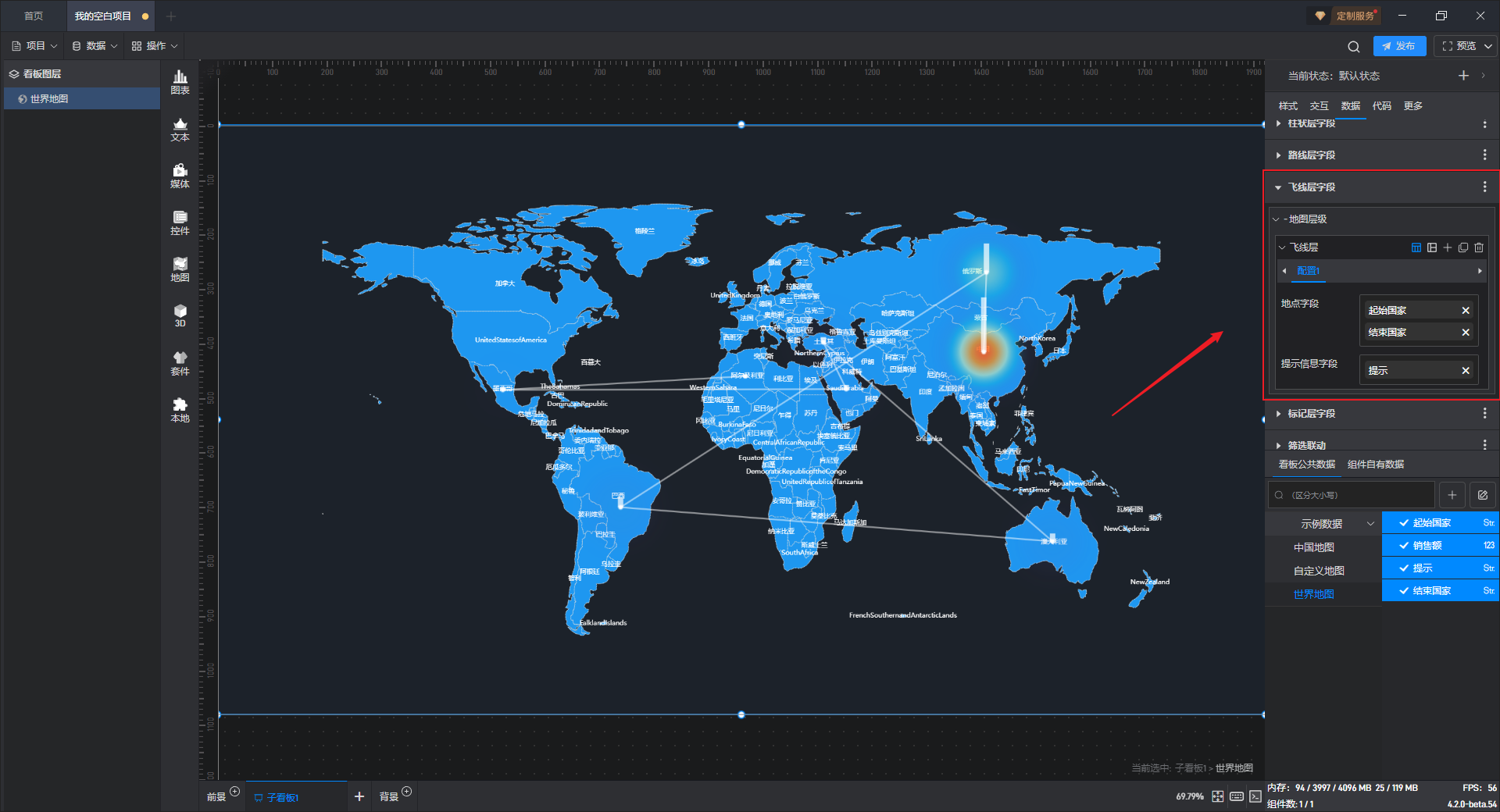 世界地图组件有 7 个数据字段,分别是底图层字段、呼吸点层字段、热力层字段、柱状层字段、路线层字段、飞线层字段和标记层字段。