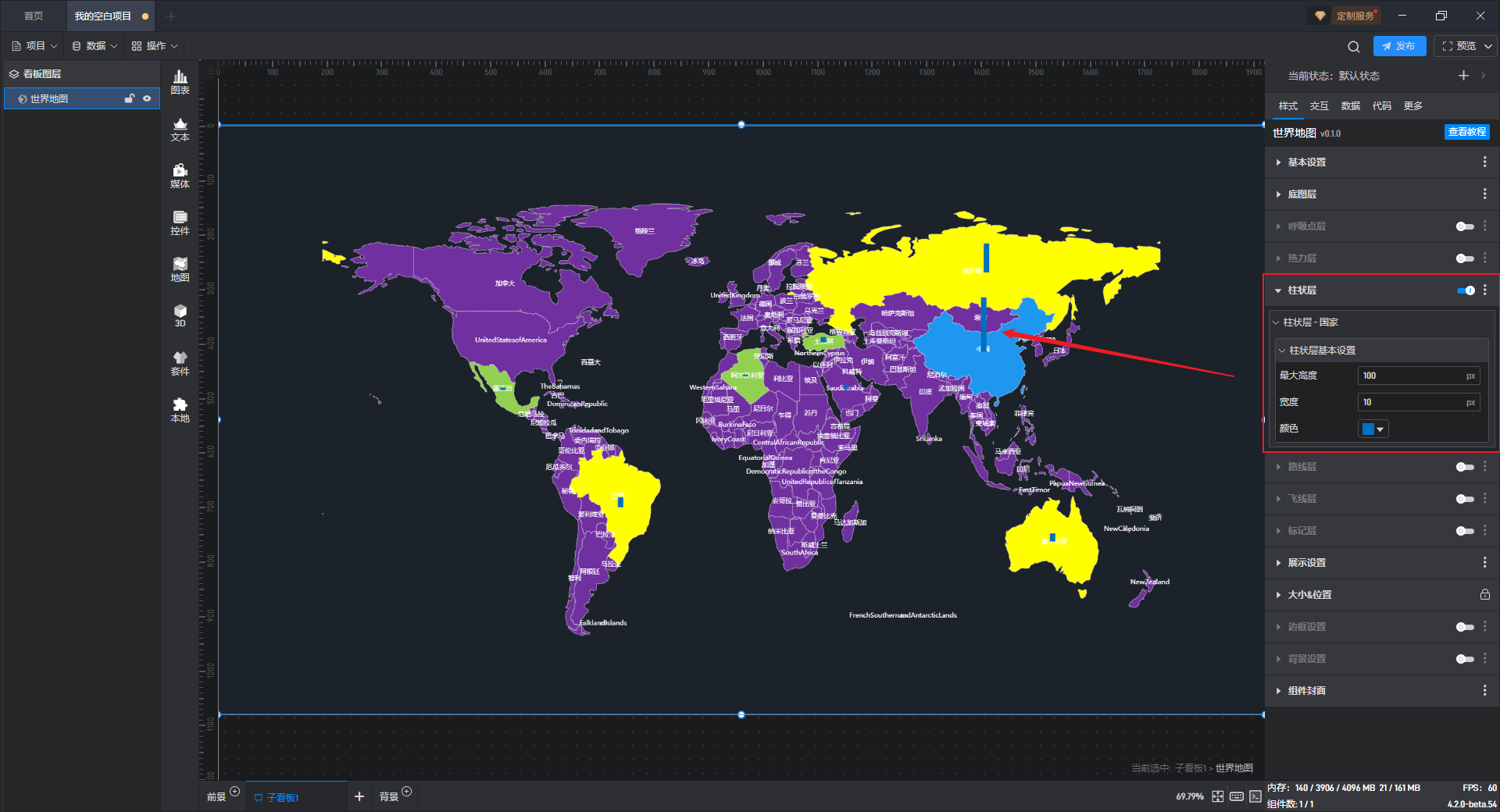 世界地图** 柱状层字段设置**,如下图所示: