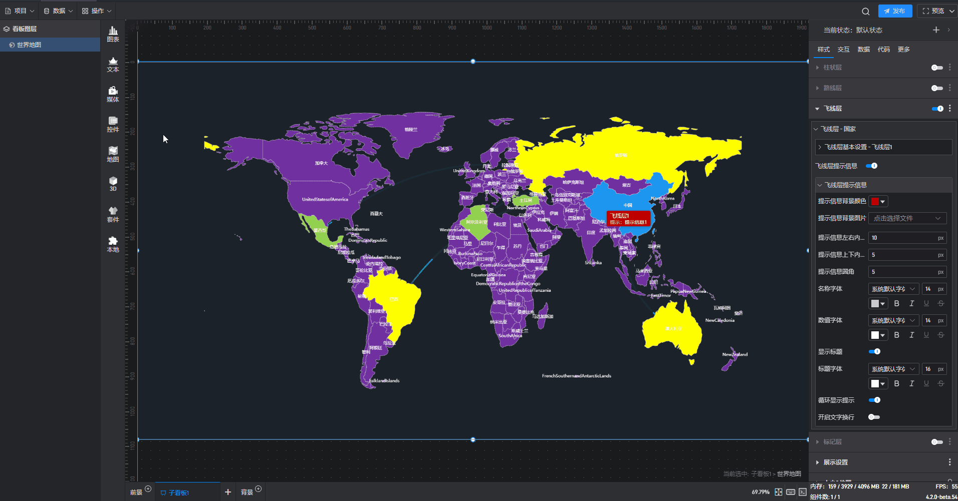 世界地图 飞线层提示信息样式,如下图所示: