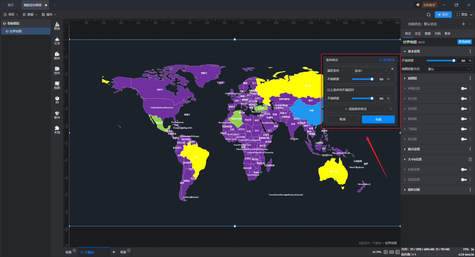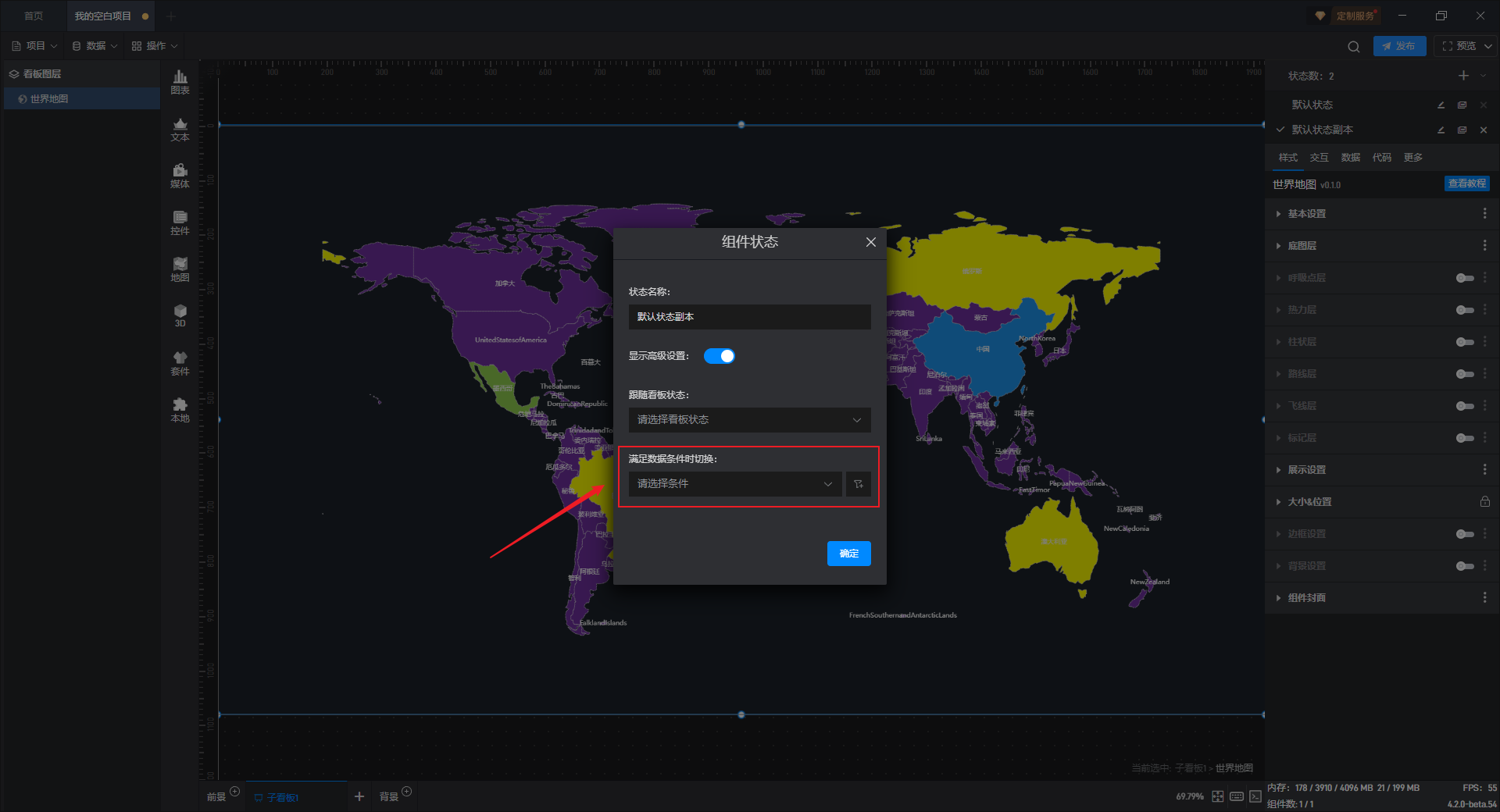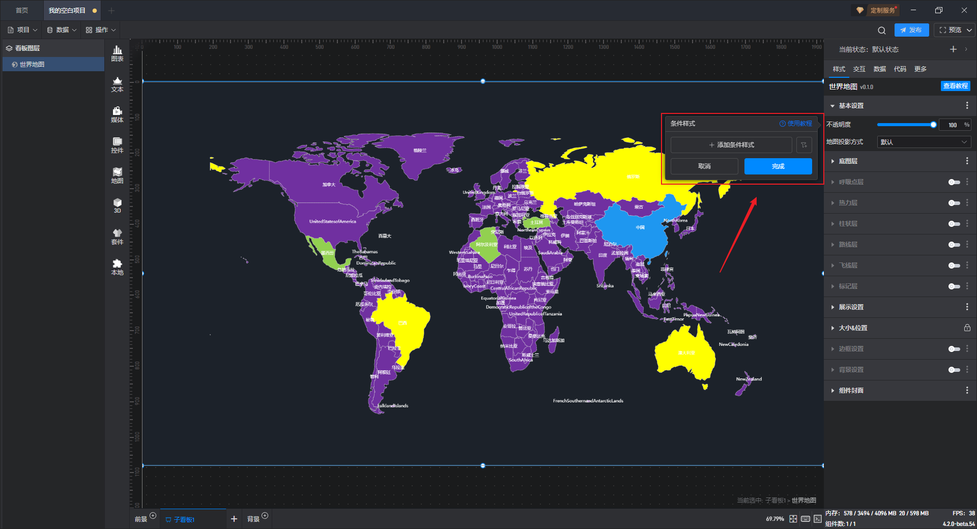部分设置项的条件设置方式直接显示在该设置项中,可以直接在该设置项上设置,但世界地图的条件样式只能通过方式 1 进行设置。