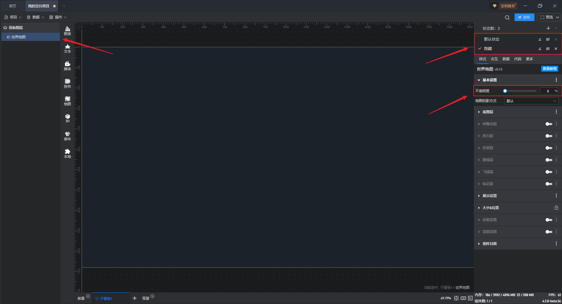 添加一个数值为“0”的数据到数据字段中,可以看到通过动态数据字段将不透明度的数值修改为“0”,从而使组件隐藏。