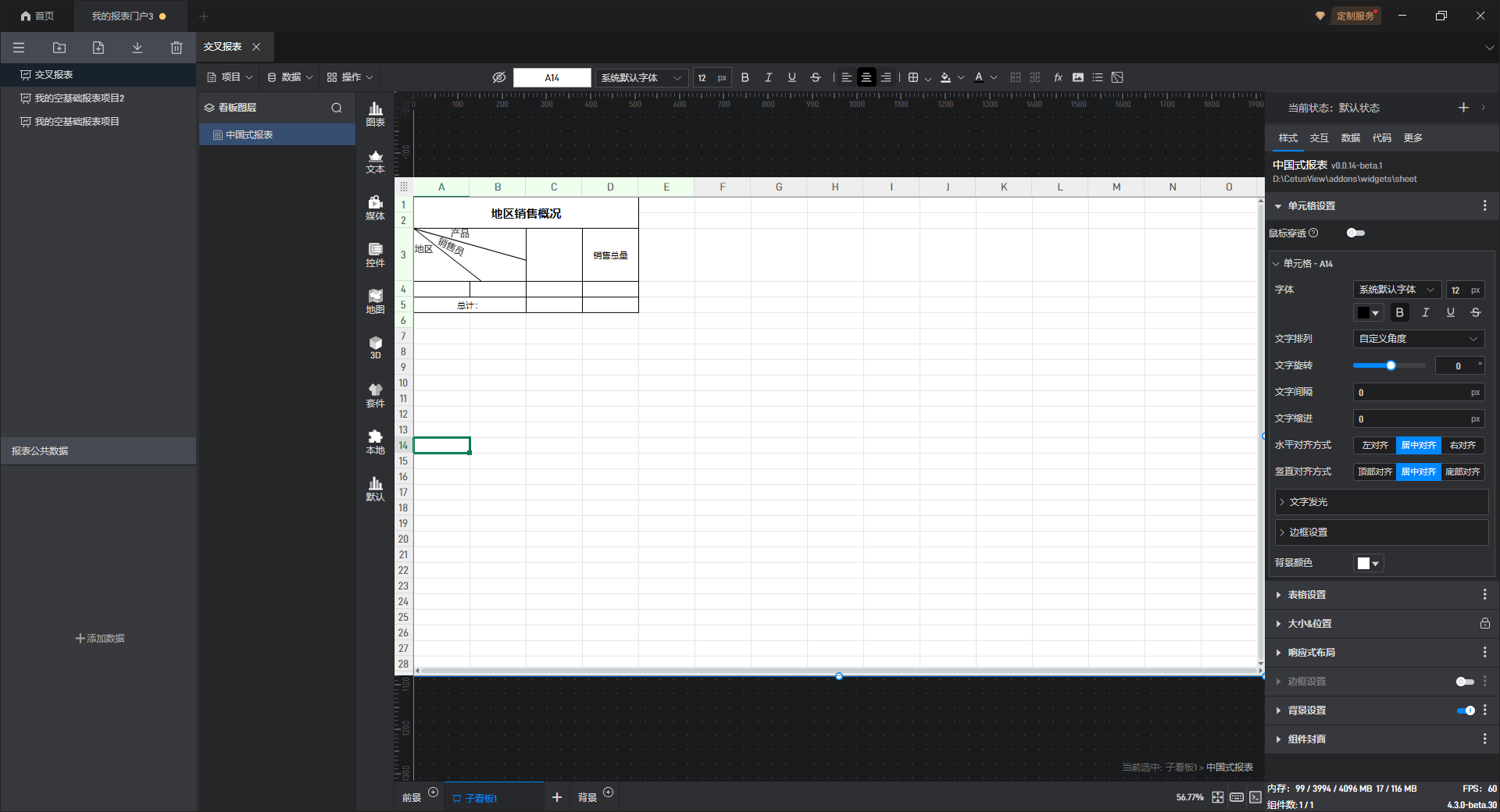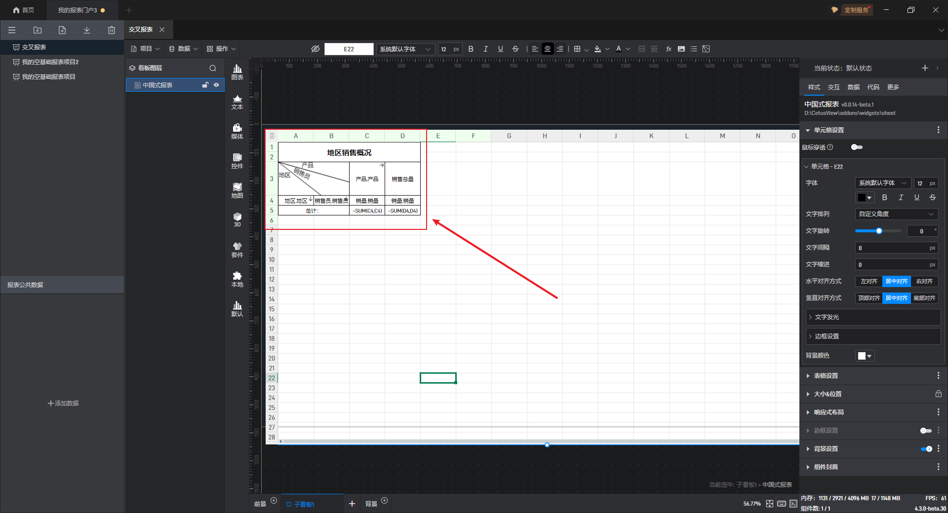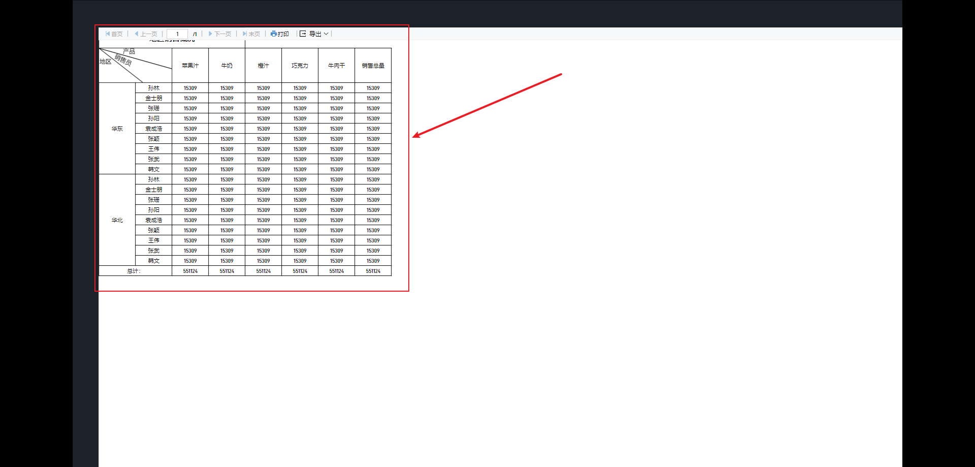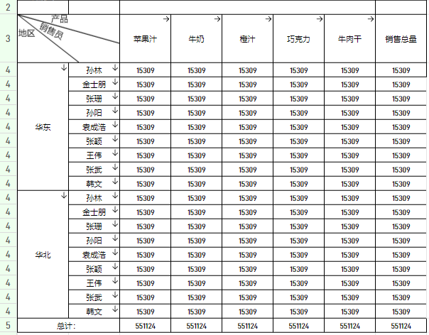 交叉报表的特点是表头是由上表头和左表头组成,从形式上来看,有点类似于数学上的二维数列,将数据按照行和列进行分类。如下图即为典型的交叉报表,将销售数据按照产品、销售员和地区进行分类展示。