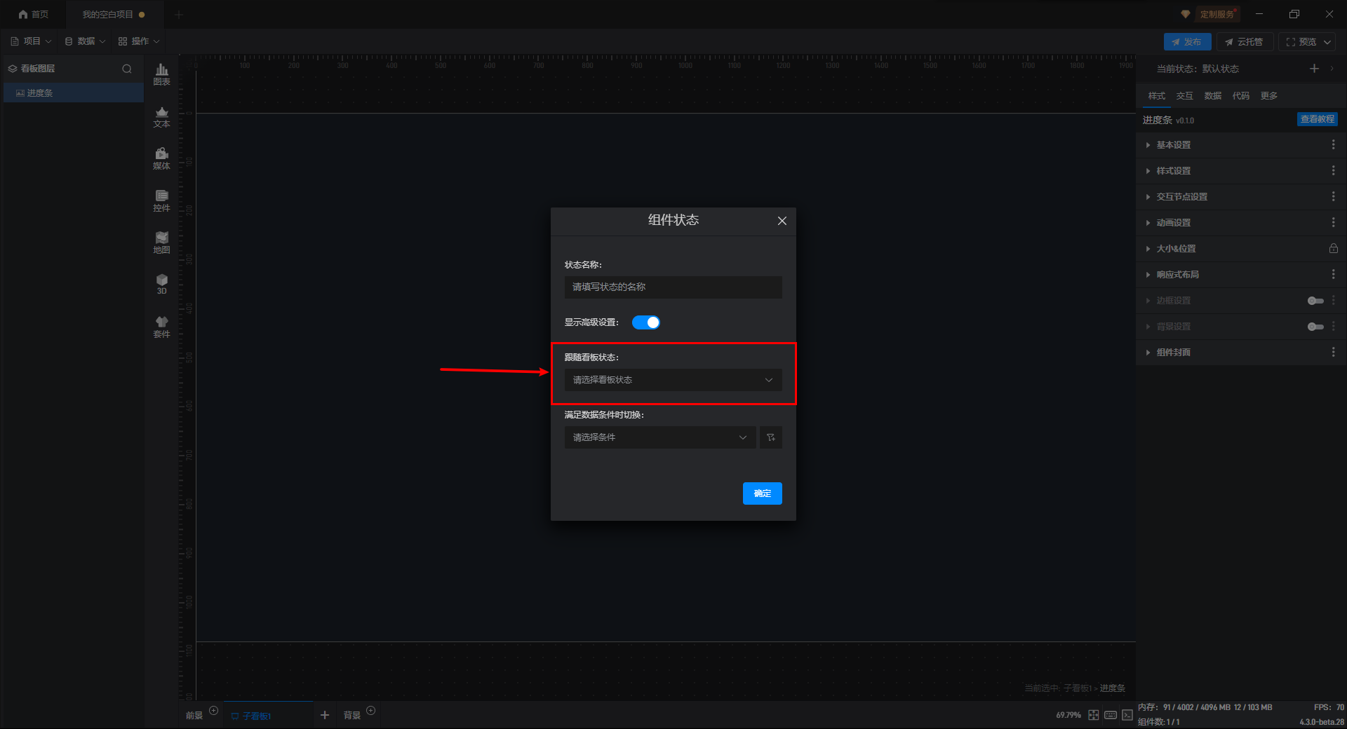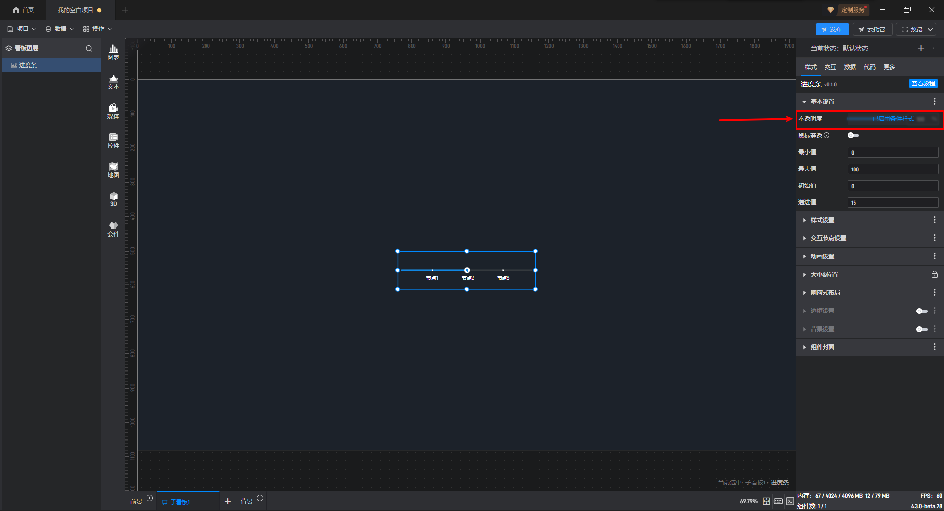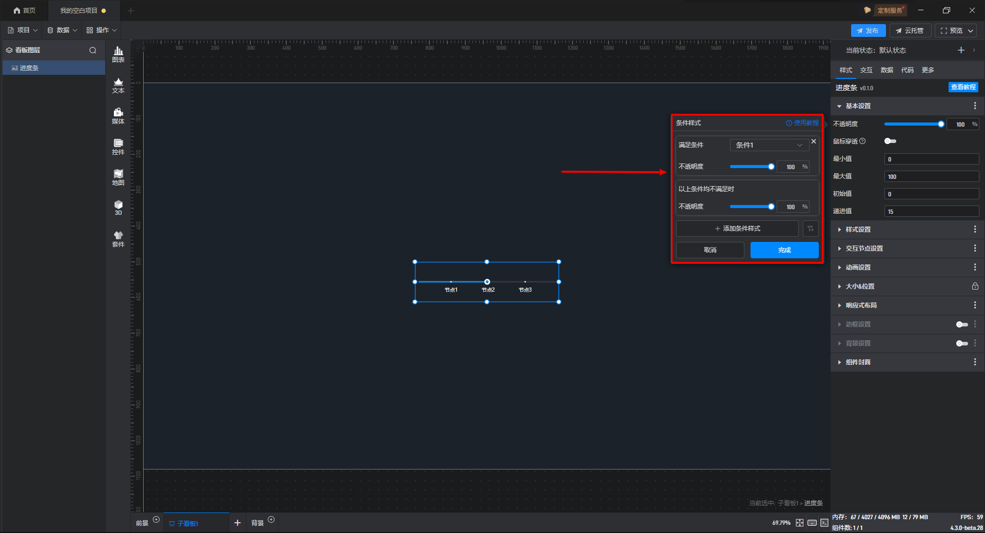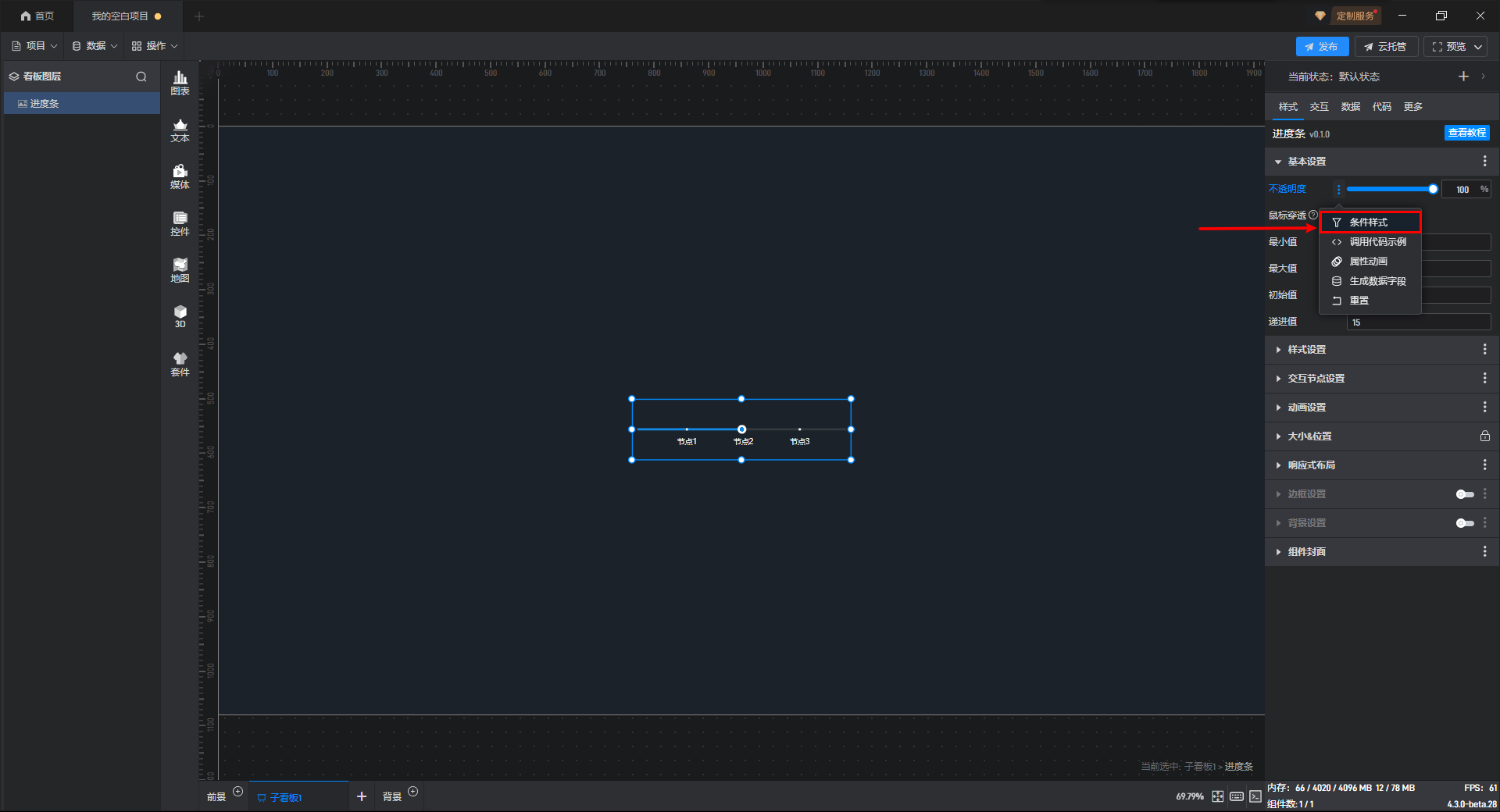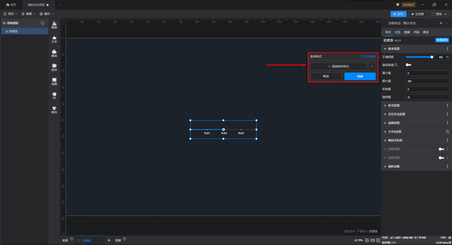 进度条组件的条件设置方式为第一种,具体步骤如下:
