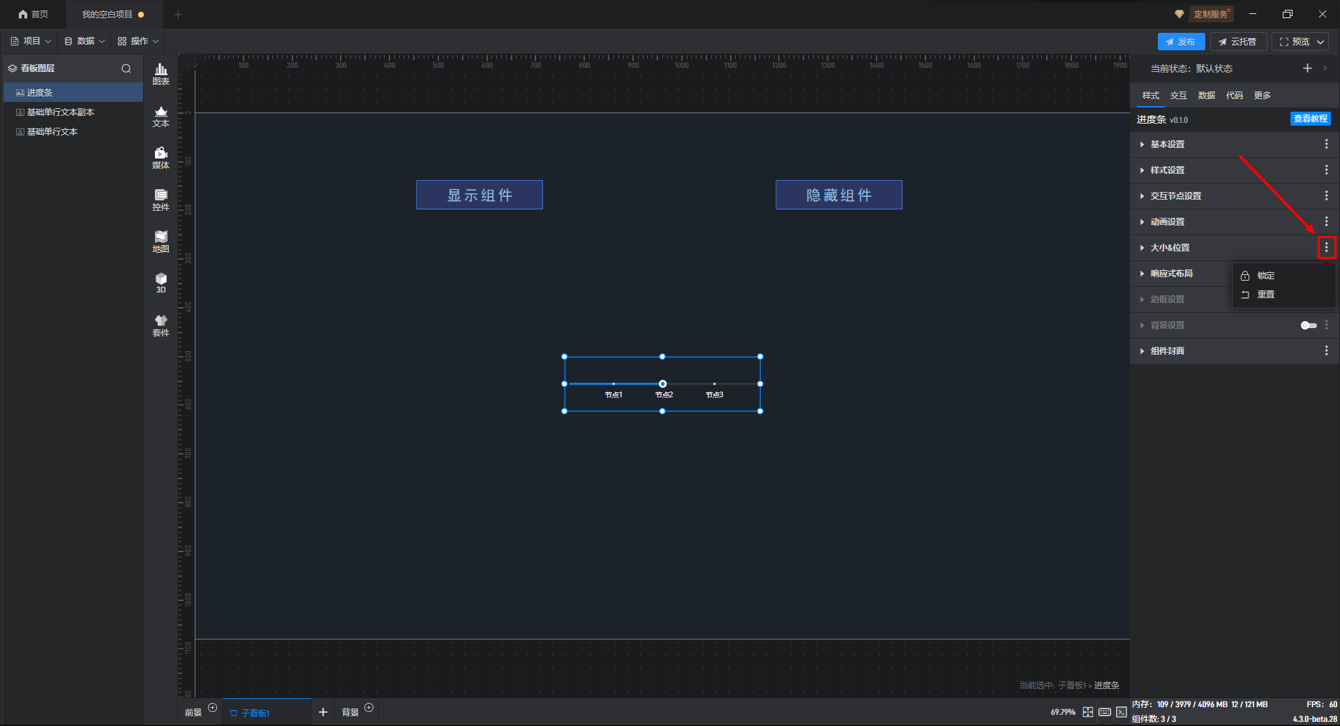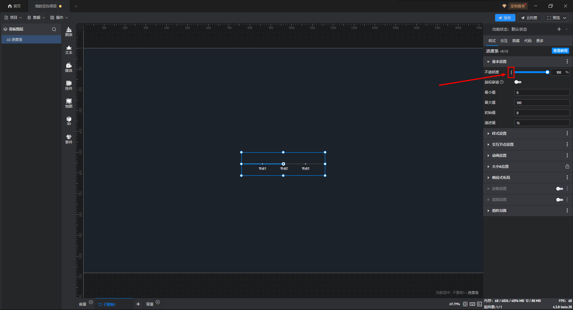 点击选中组件,将鼠标移动到该设置项上,就可以看到设置项名称右侧会出现三个点(扩展设置进度条)。