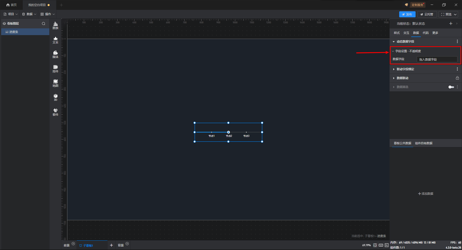 切换到“数据”设置界面,此时可以看到界面中新添加了一个“动态数据字段”的设置项,并且针对刚才选择的“不透明度”设置项生成了一个关联的字段。