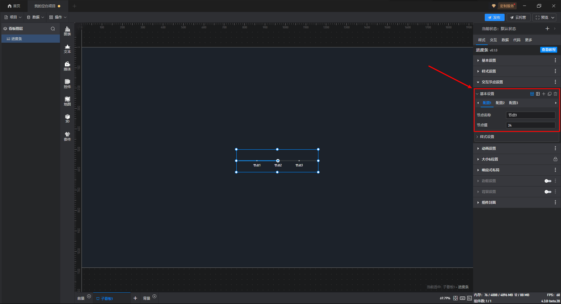 节点值 | 自定义设置节点在进度条上所处的位置,三个配置项中,节点值的默认值分别为“24”、“51”、“78”。 |