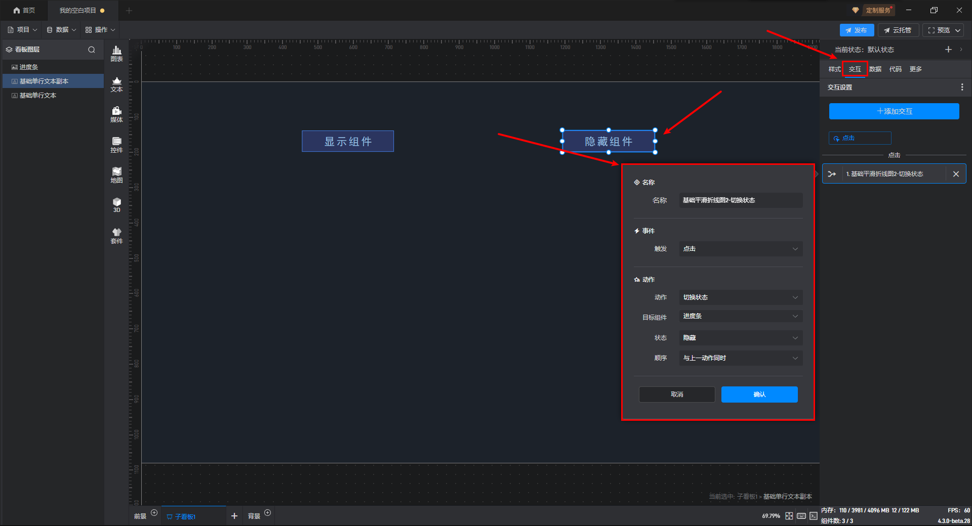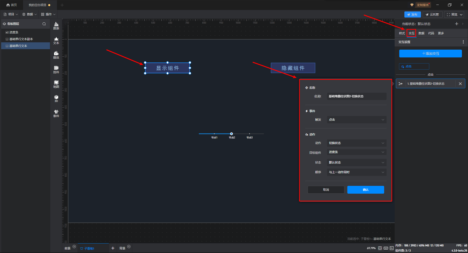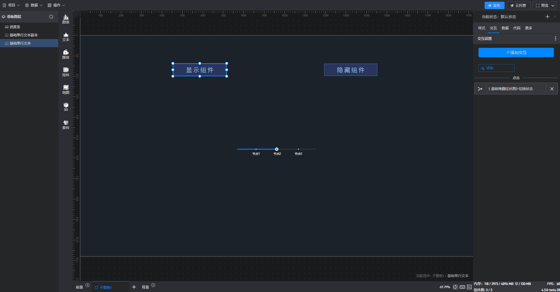 通过点击交互来切换组件状态一般是点击其他组件来切换当前组件的状态,但是进度条组件一般是触发交互的组件,所以需要在进度条组件上设置交互。举个例子,点击进度条切换当前组件的显示隐藏状态。