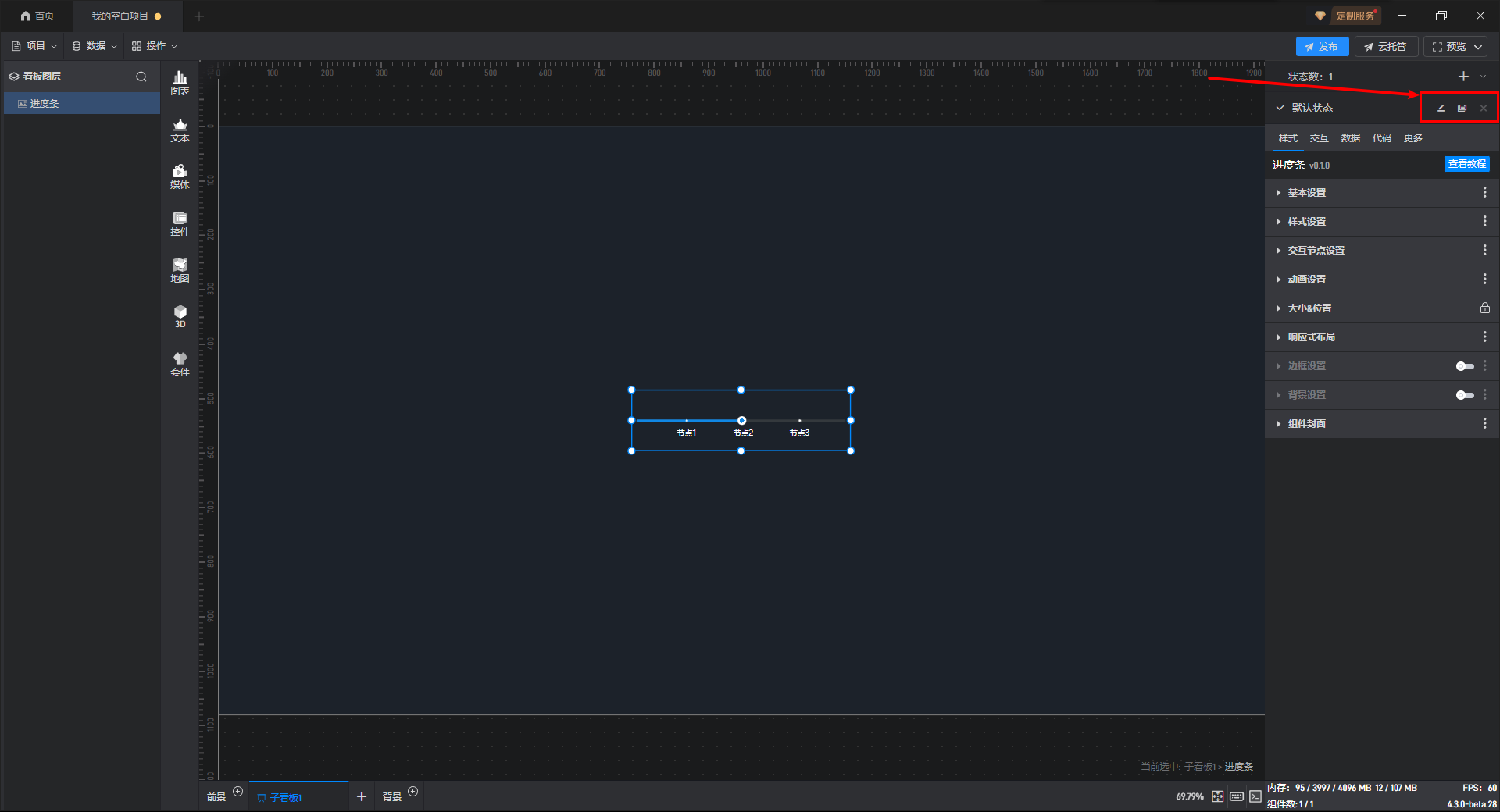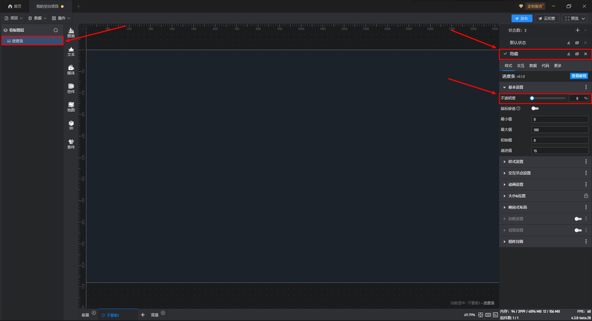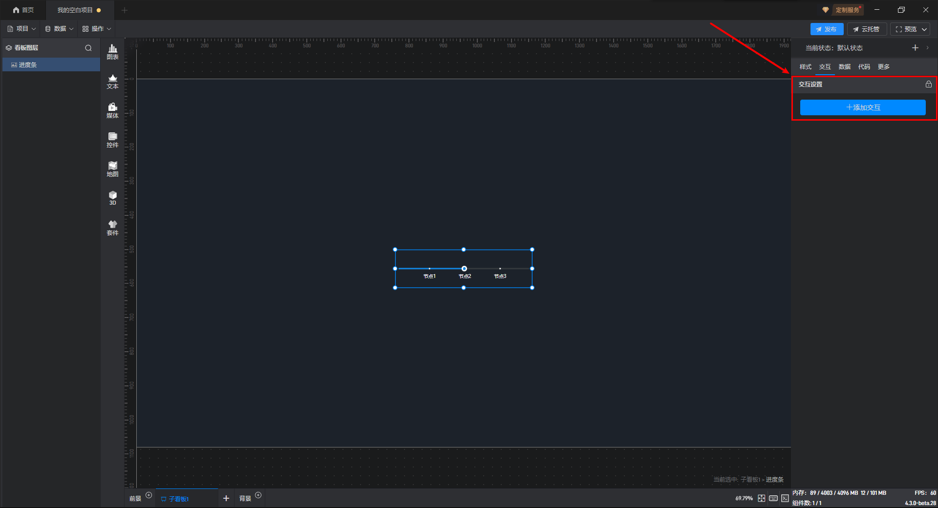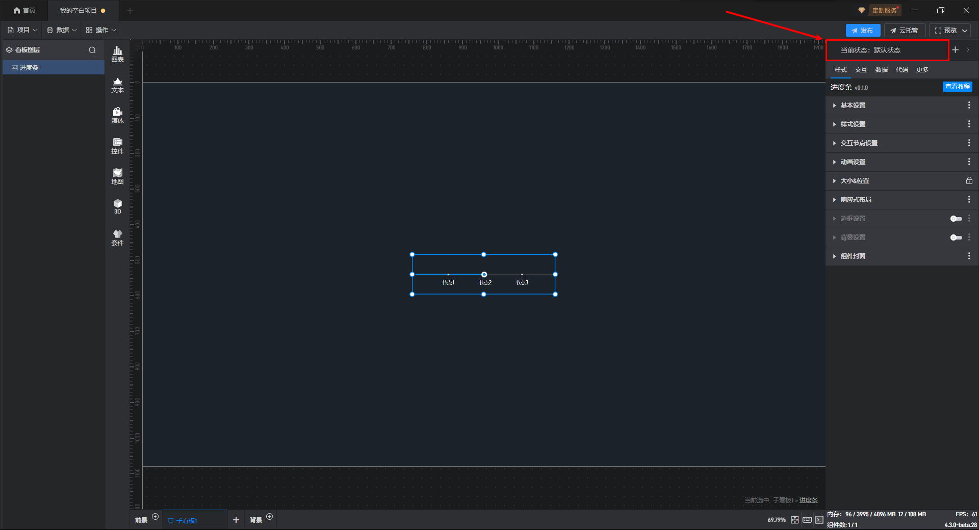 通过点击交互来切换组件状态一般是点击其他组件来切换当前组件的状态,但是进度条组件一般是触发交互的组件,所以需要在进度条组件上设置交互。举个例子,点击进度条切换当前组件的显示隐藏状态。