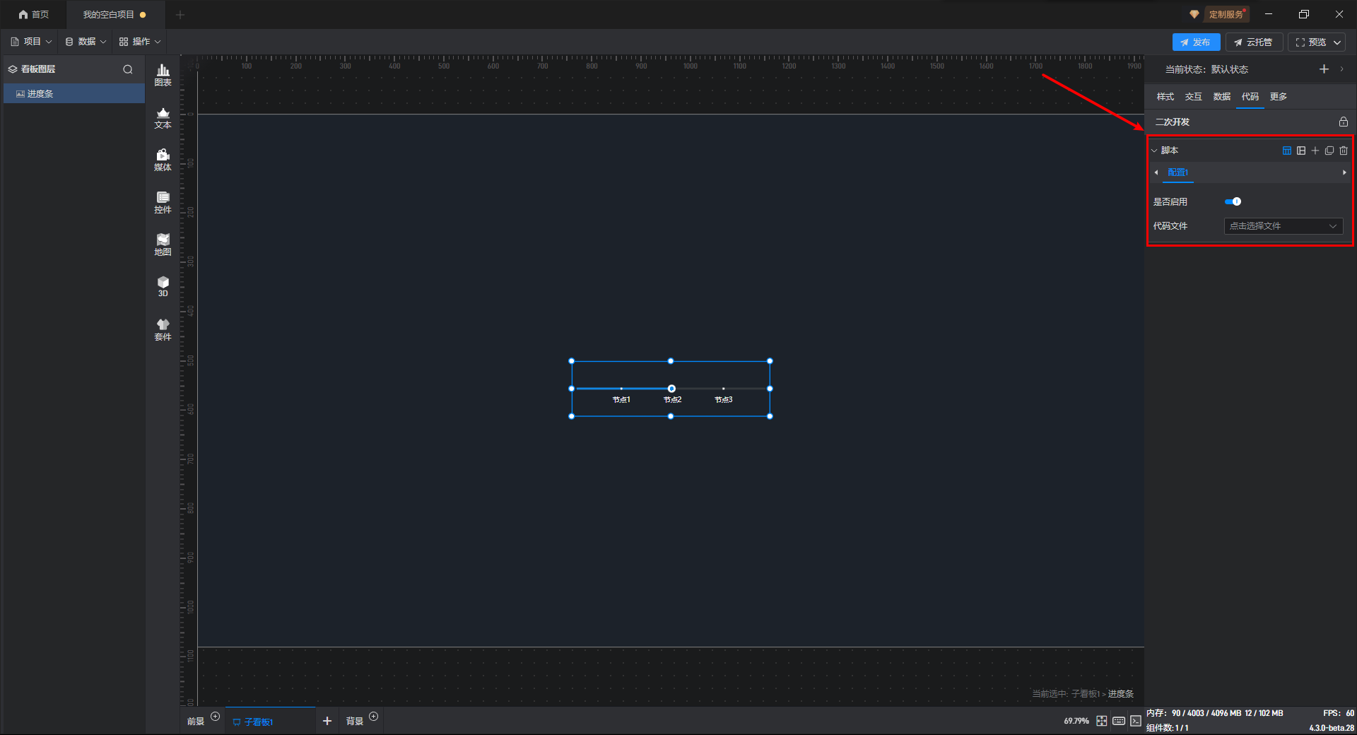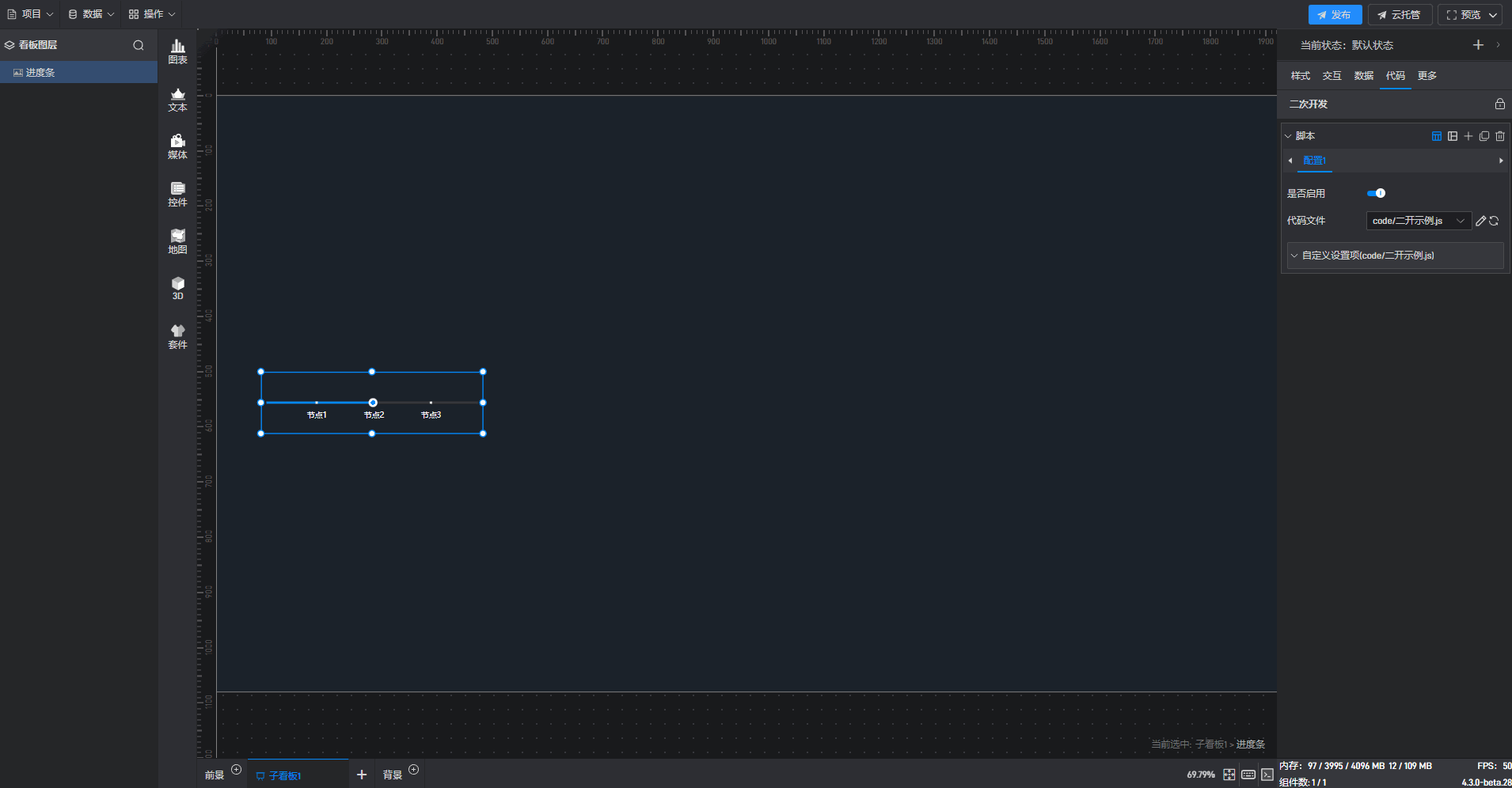 点击选中组件,在右侧设置窗口中切换到“代码”,可以对组件进行二次开发设置。