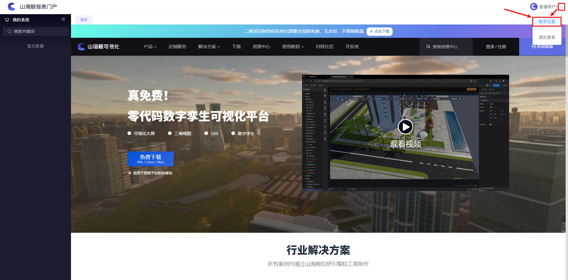 对于手动添加的用户,用户登录报表门户系统后,点击右上角“箭头”按钮,点击“账号设置”。