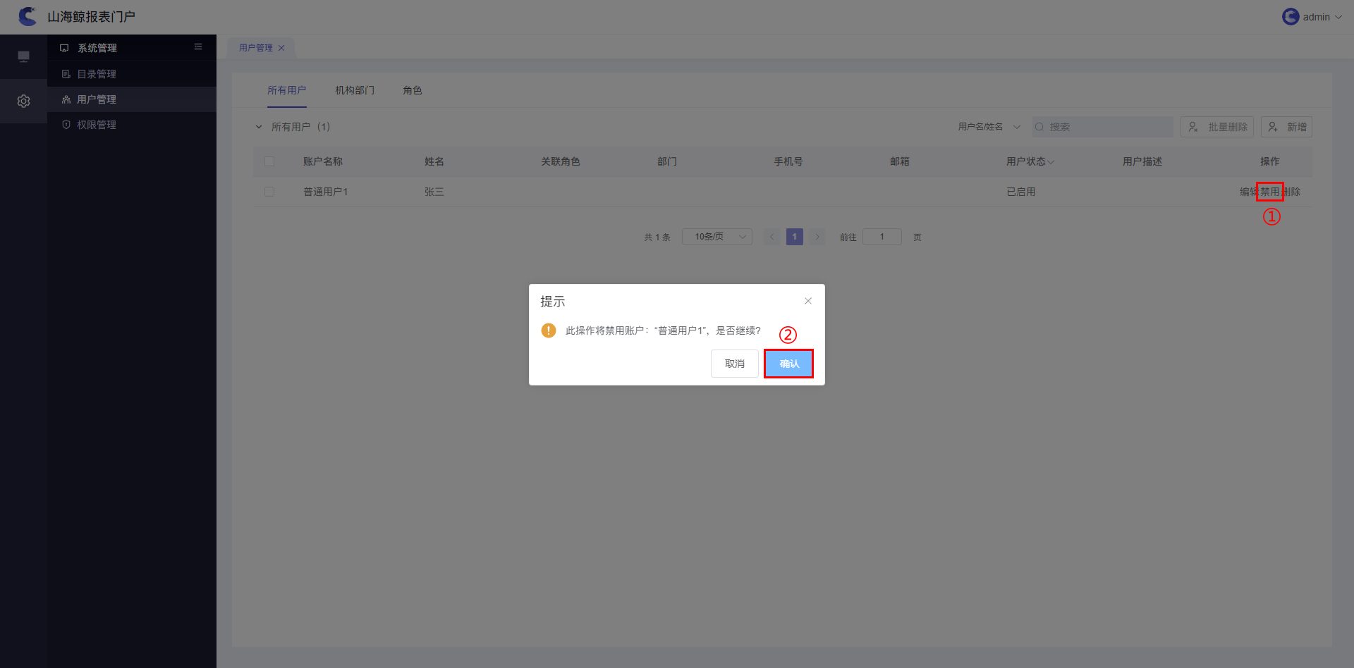 管理员点击“禁用”按钮,在弹出窗口中点击“确认”按钮,即可禁用用户,如下图所示: