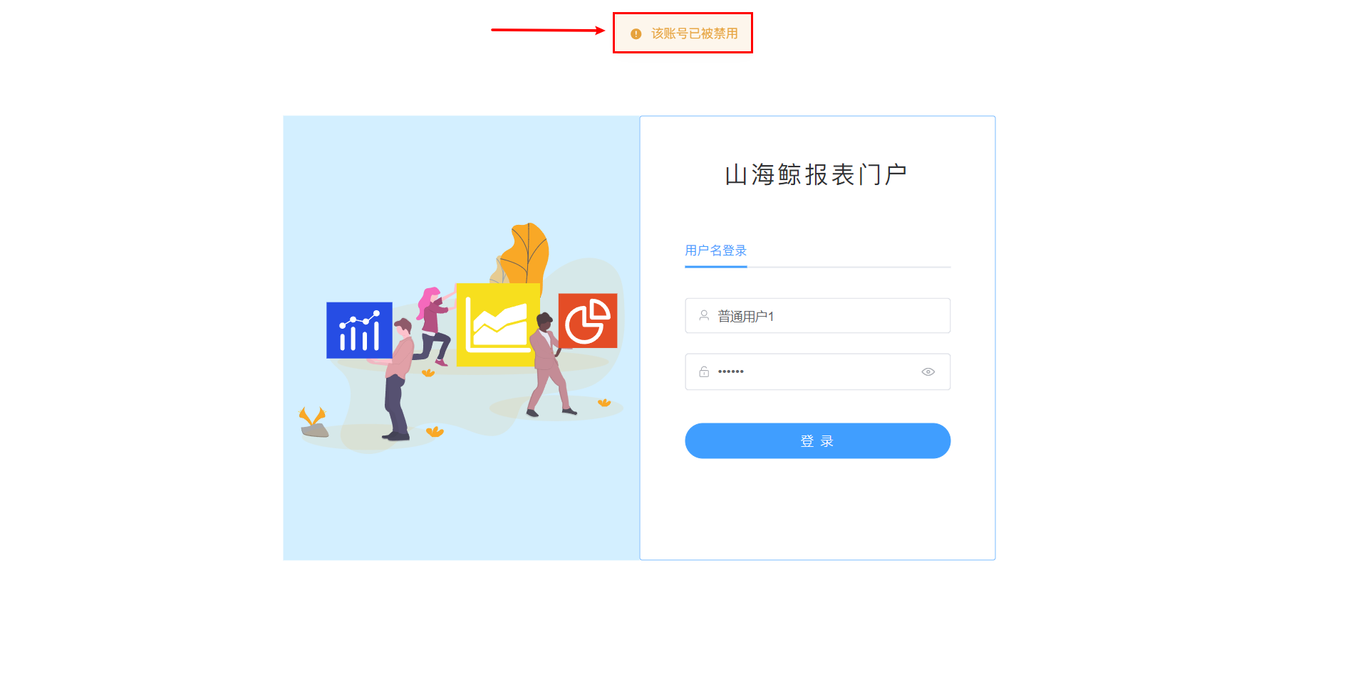 2)若被禁用的用户未登录报表门户系统,登录时提示“该账号已被禁用”,如下图所示: