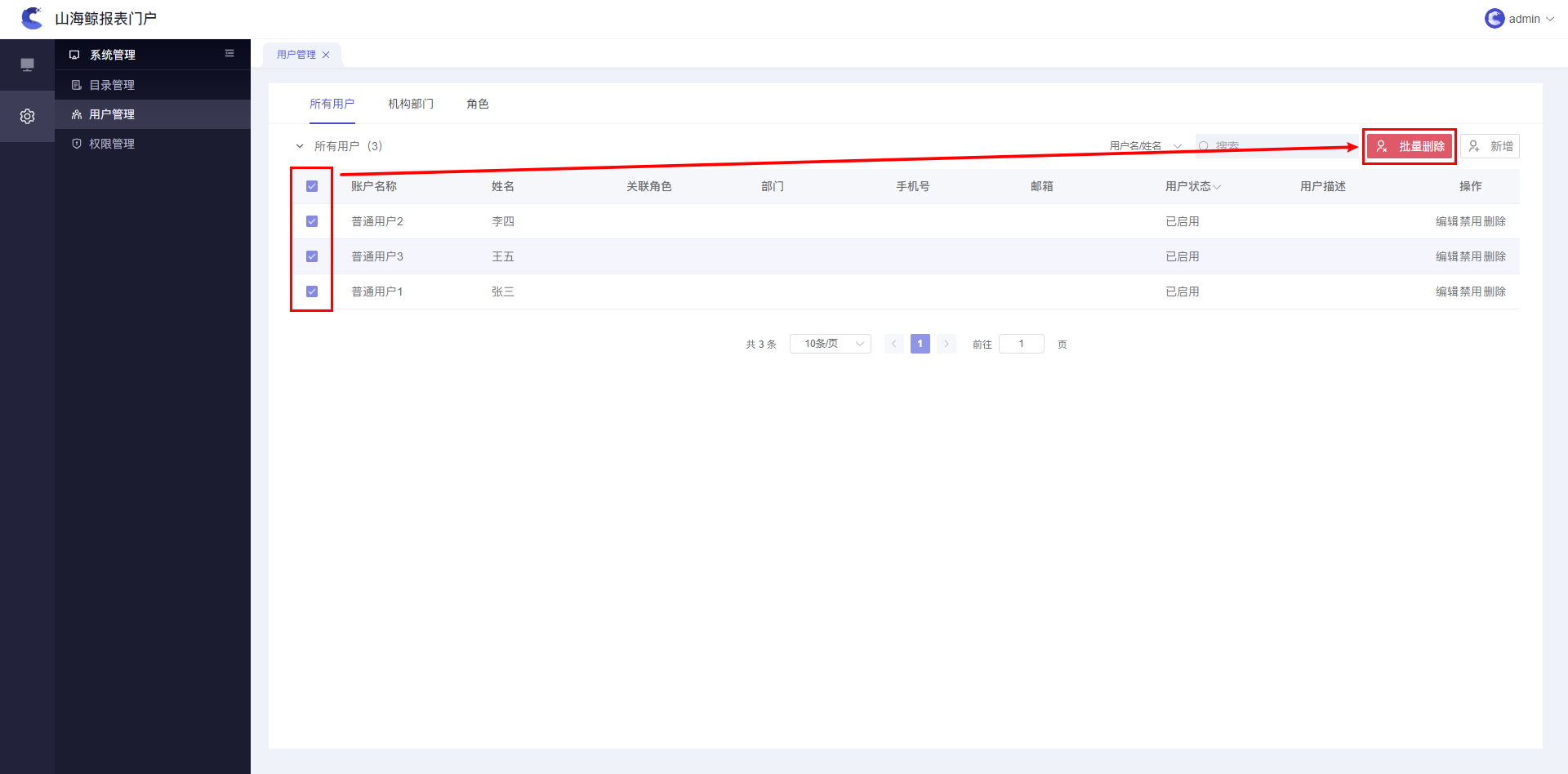 手动添加的用户,支持批量删除或单个删除。如下图所示: