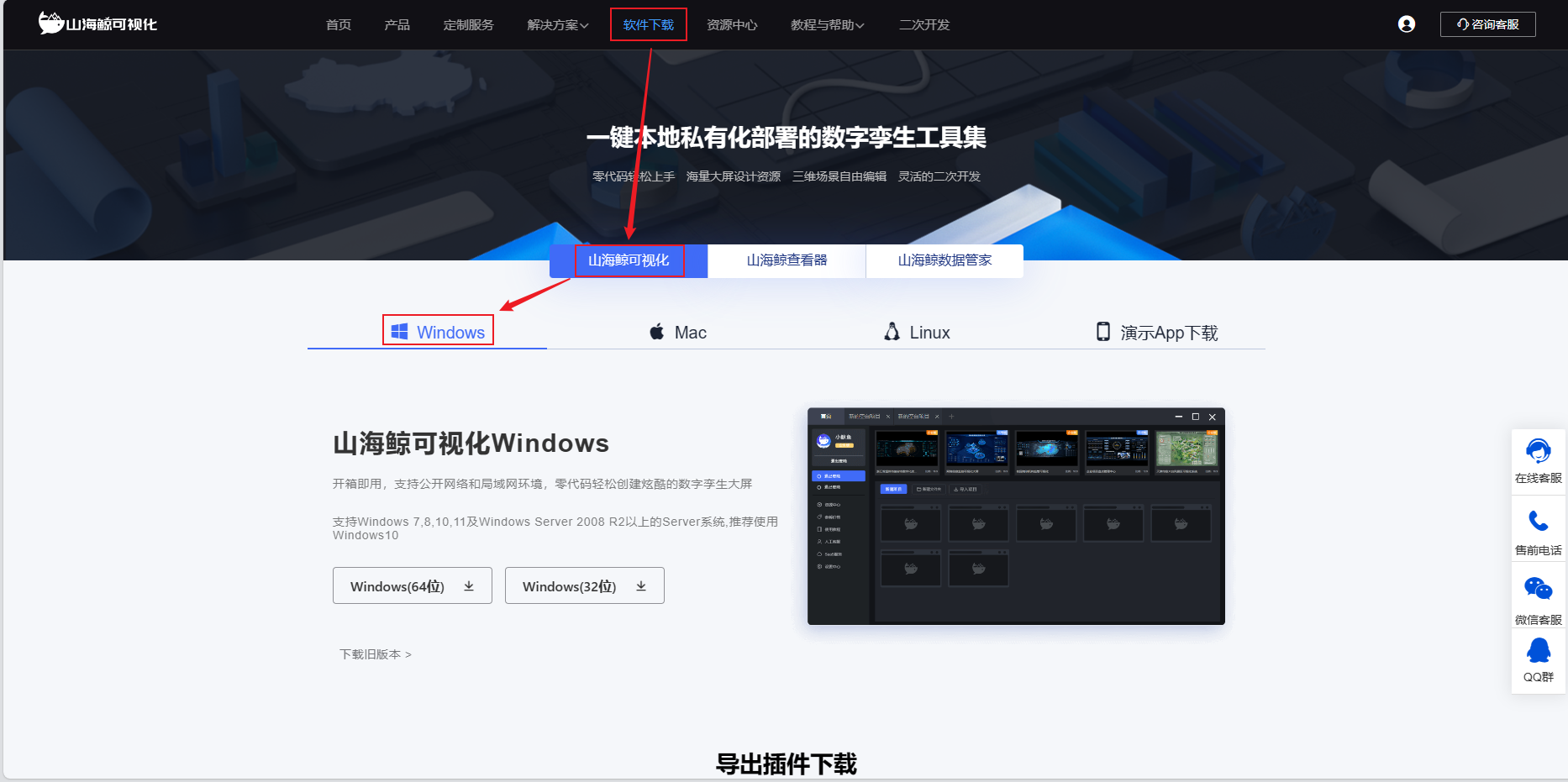 首先,您可以在山海鲸可视化官网中找到安装包下载页面,位置如下图所示: