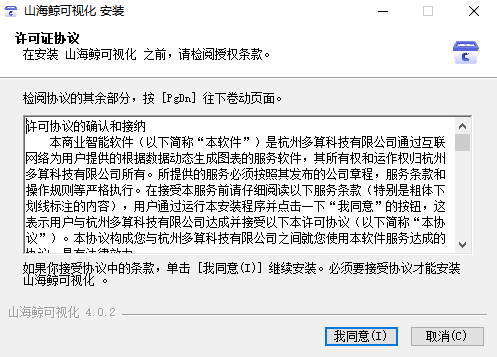 下载完成后请打开安装包并仔细阅读许可证协议内容,若无疑义请点击“我同意”并开始进行下一步安装。