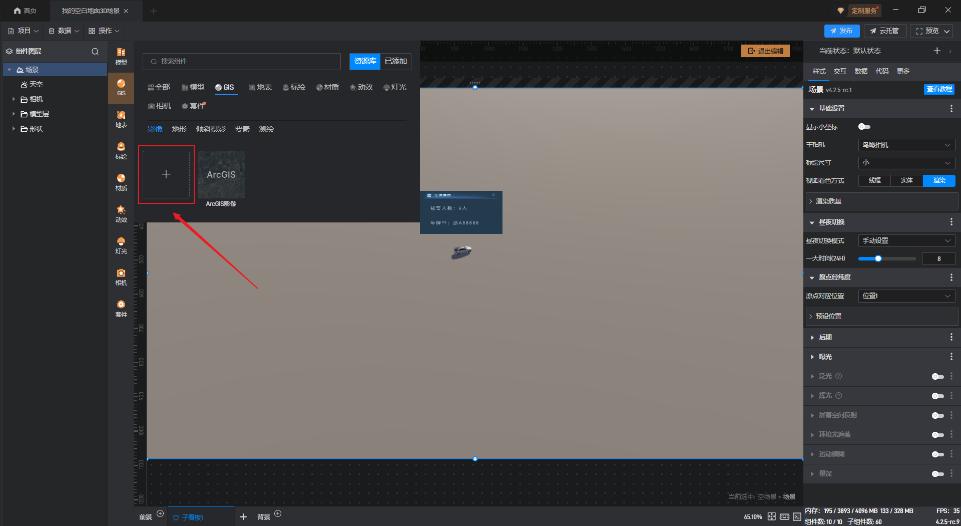 1)山海鲸可视化软件鲸孪生编辑模式下,在 GIS 服务中点击“+”添加影像。