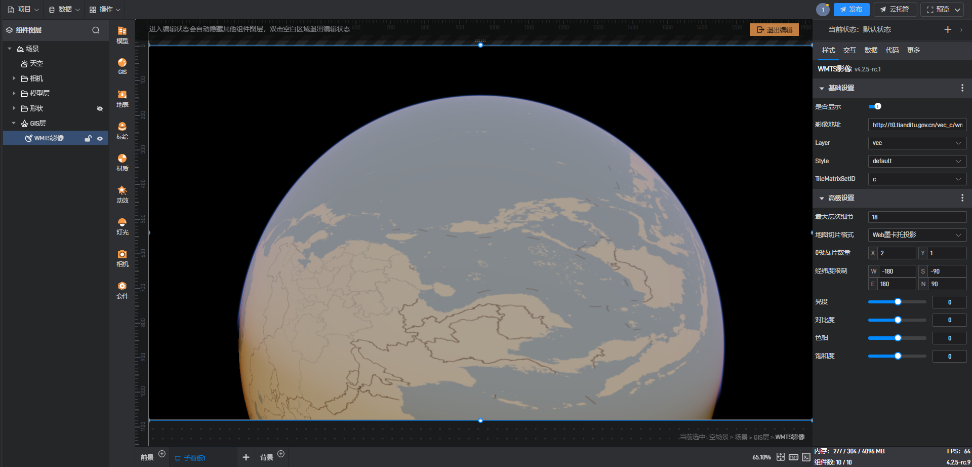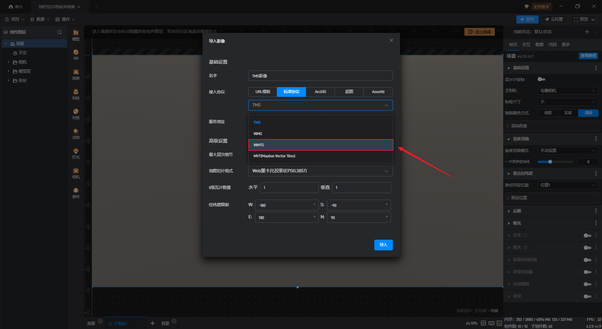 山海鲸可视化软件支持各种 GIS 协议的接入,如 TMS、WMTS、3DTiles、HeightMap、Quantized-Mesh 等,其中,天地图使用的就是 WMTS 协议。
